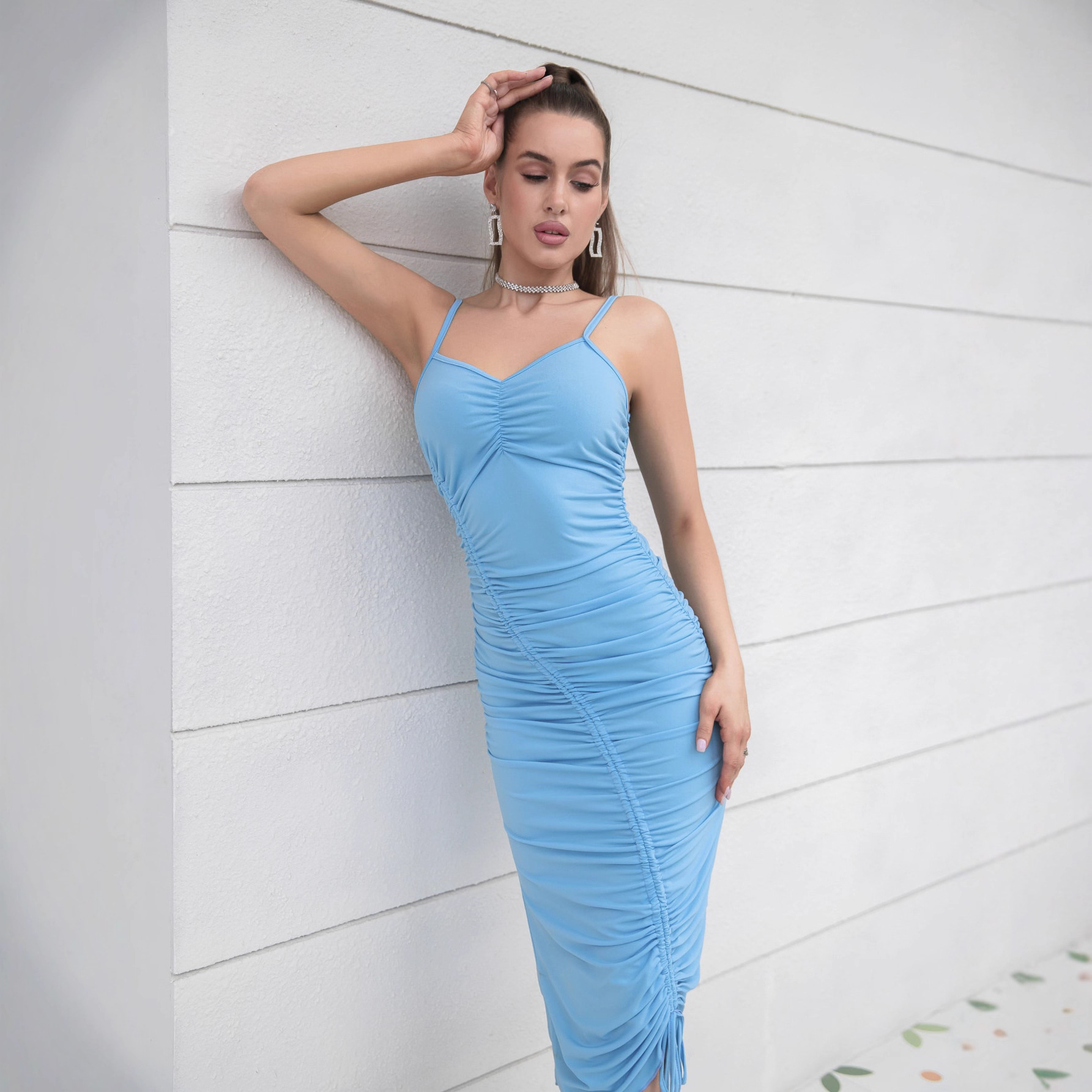 Copy| Product Name | Deep V-Neck Sleeveless Strap Women's Ruched Sexy Bodycon Dress |