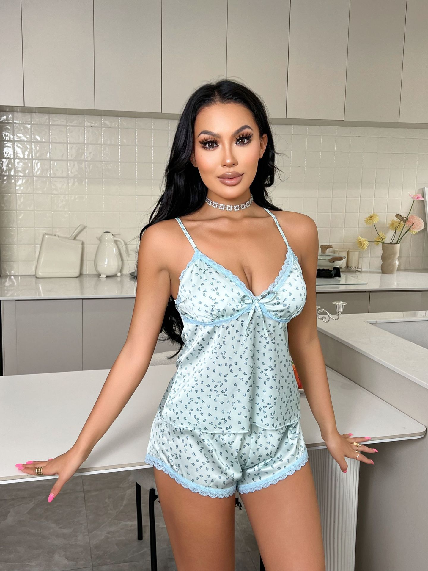 Copy| Product Name | Floral Strap V-Neck Pajama Shorts SetLoungewear |