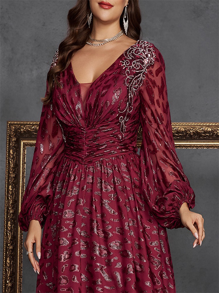 Copy| Product Name | Plus Size Women's Elegant Sequin Pleated V-Neck Long Sleeve Evening Dress |