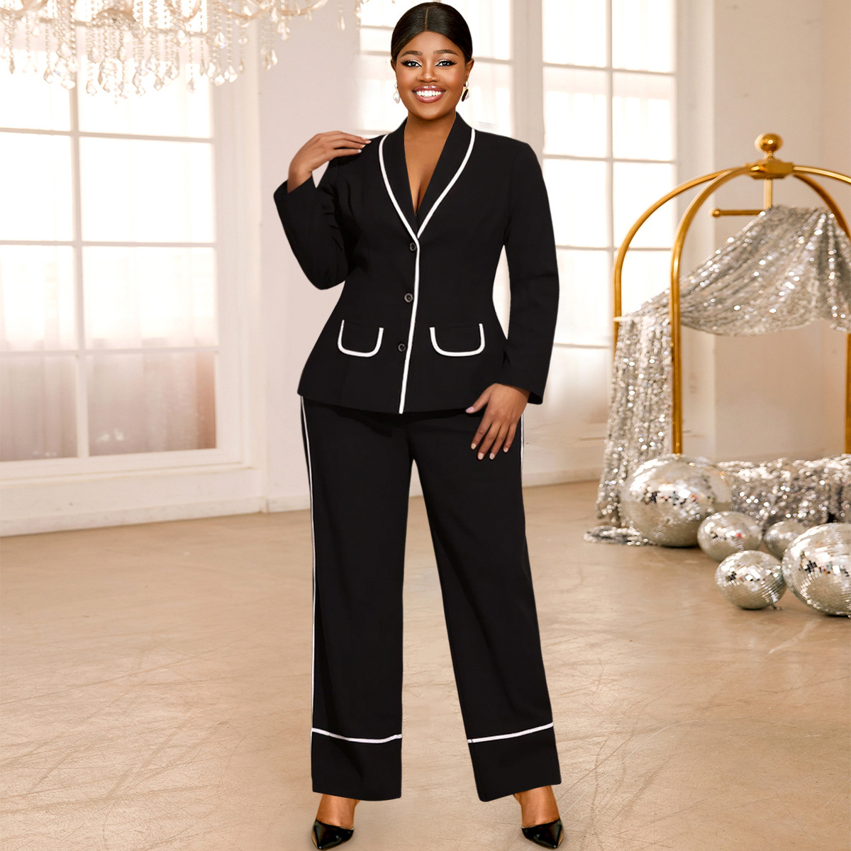Copy| Product Name | Plus Size Women's Fashion Black Contrast Trim V-Neck Blazer and Wide-Leg Pants Set |