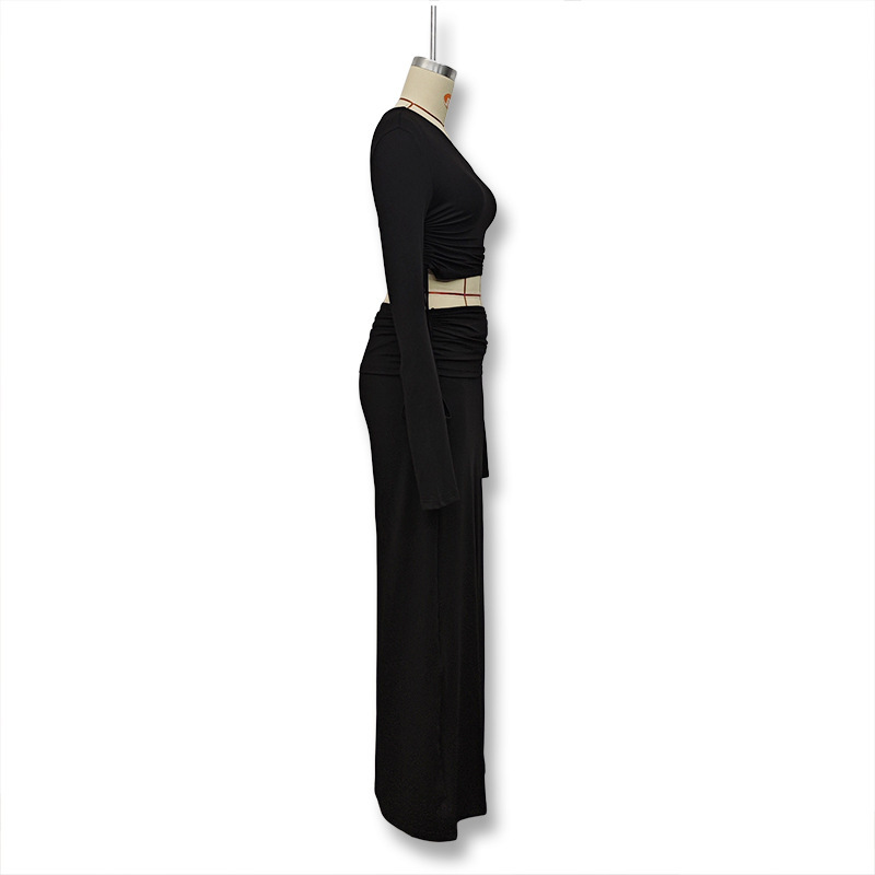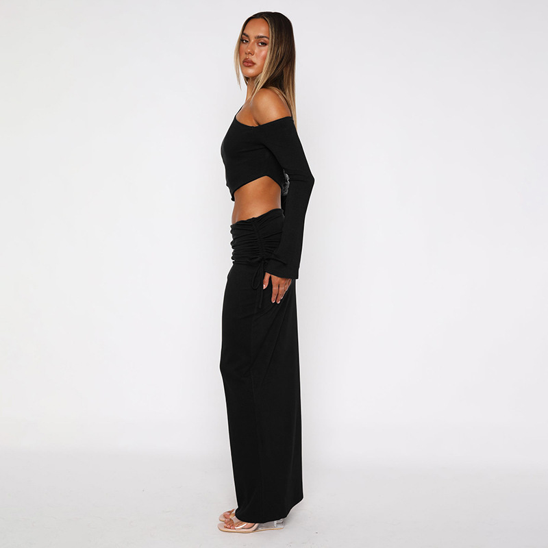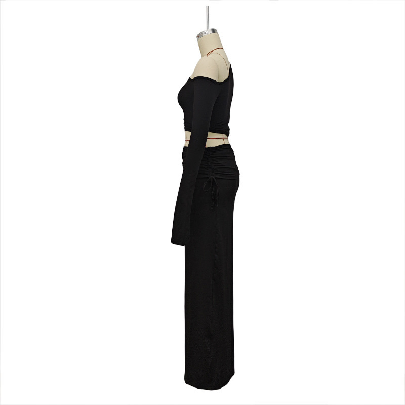 Copy| Product Name | Women Autumn Long-Sleeve Solid One-Shoulder Crop Top and Skirt Two-Piece Set |
