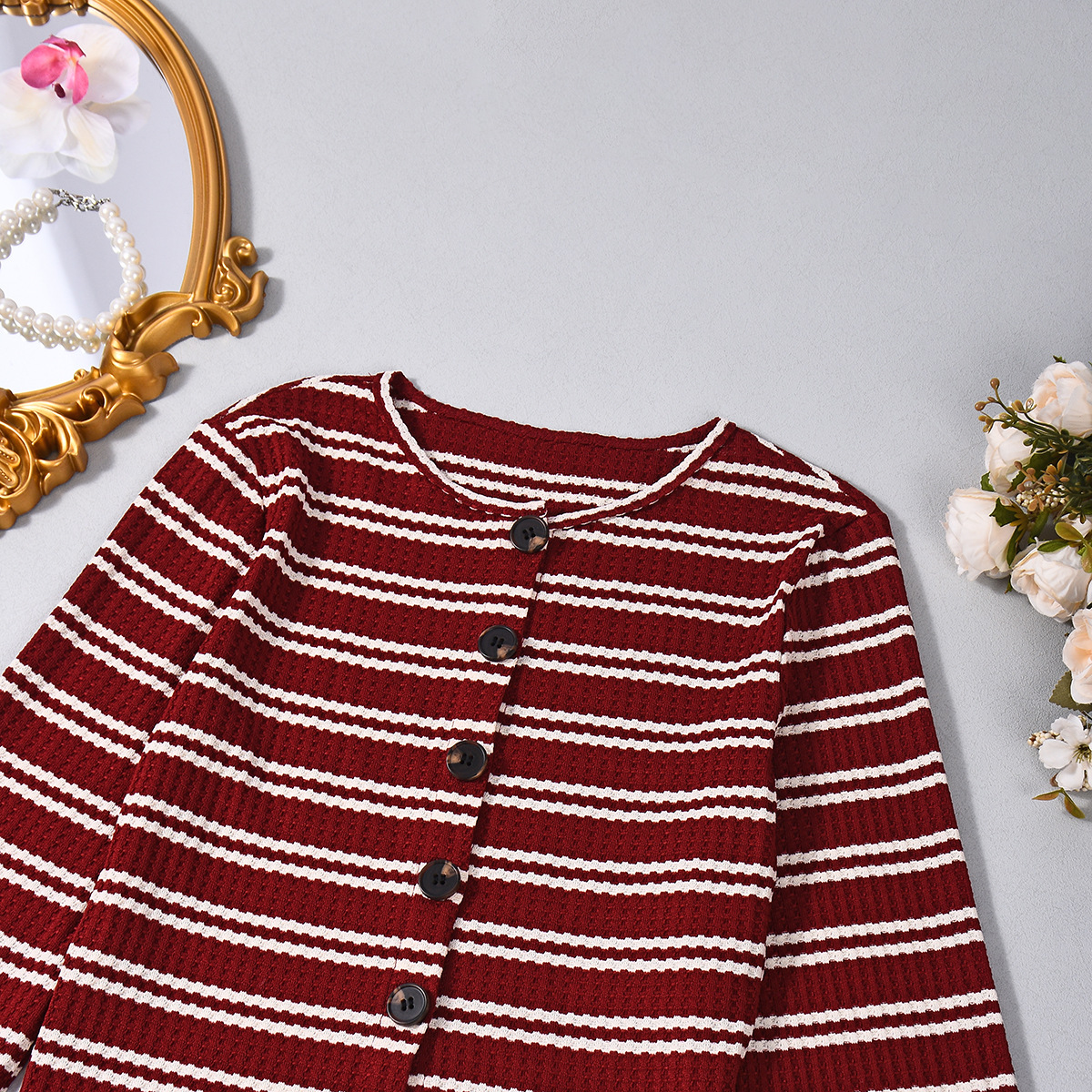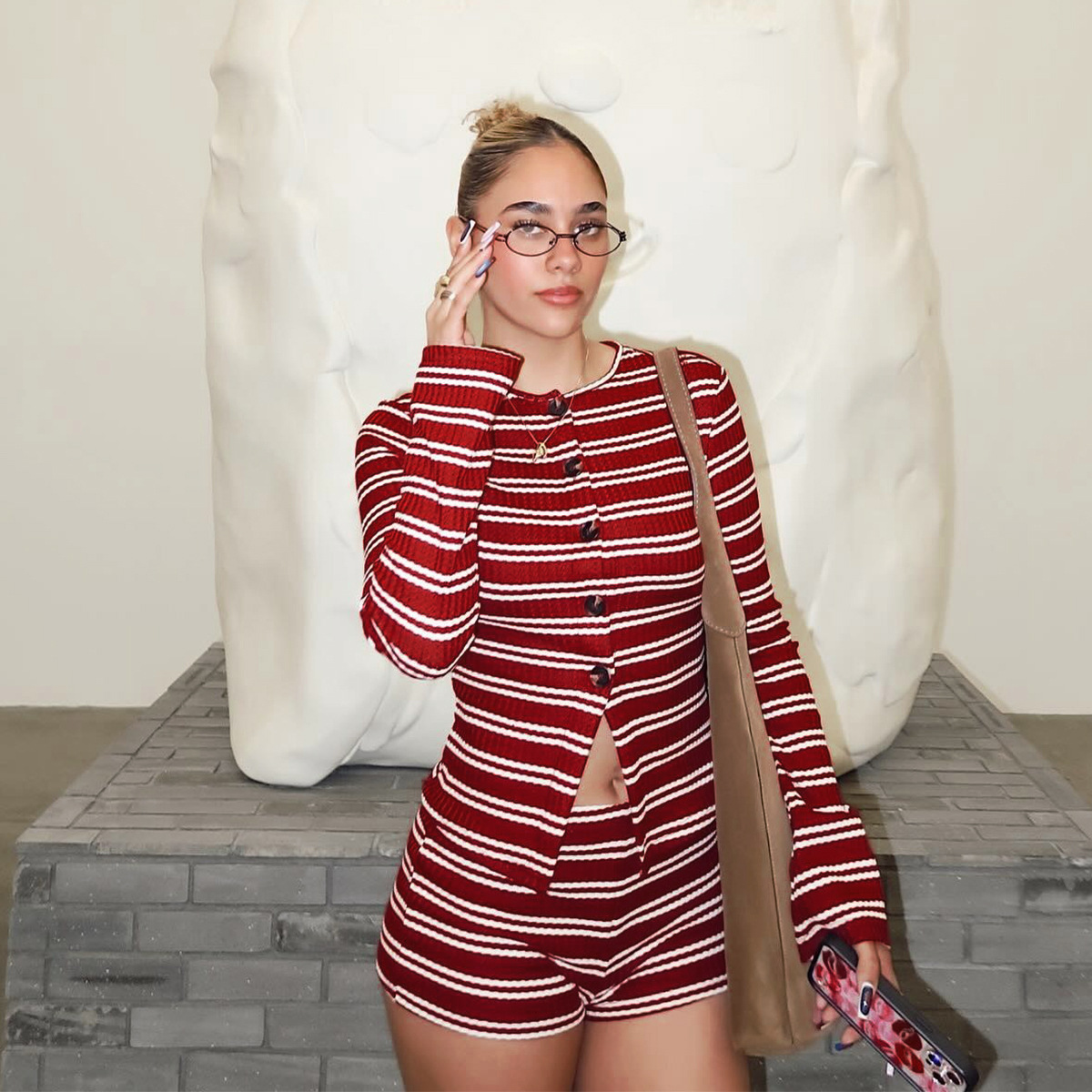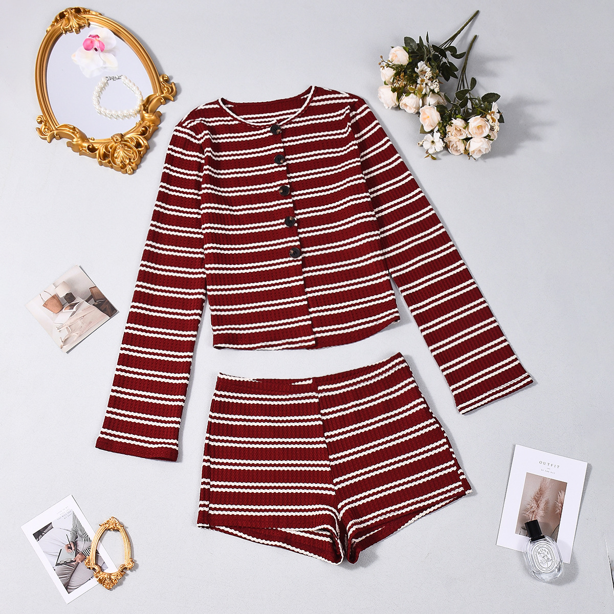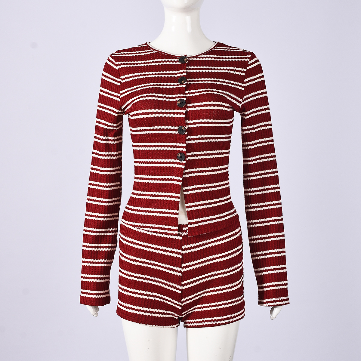 Copy| Product Name | Women Autumn Striped Long-Sleeved Top and Shorts Two-Piece Set |