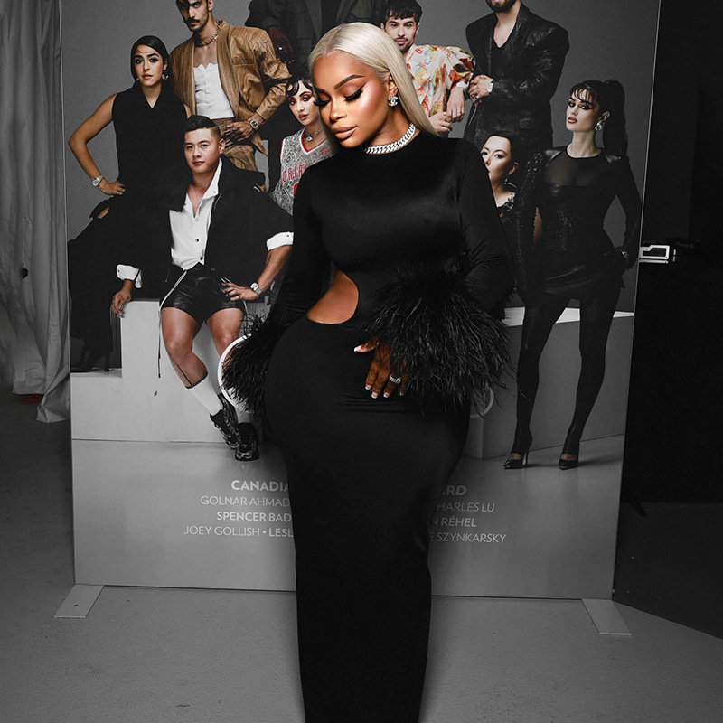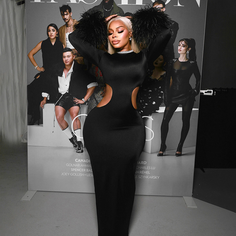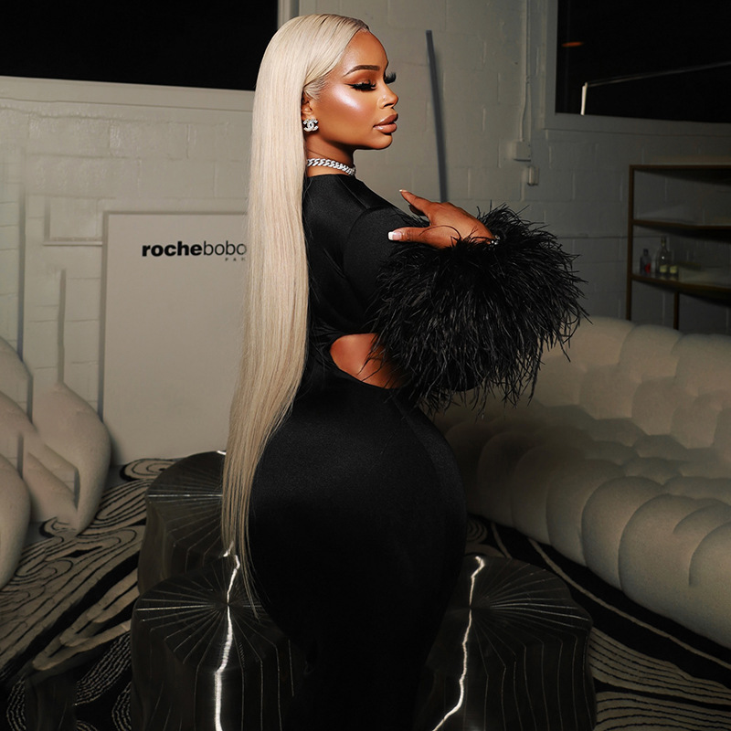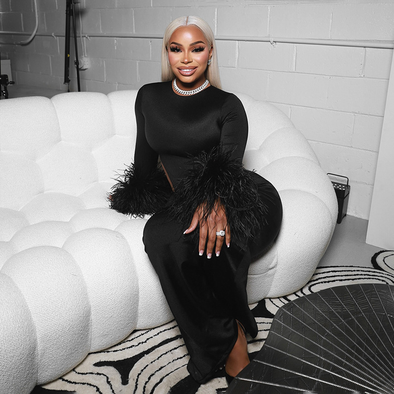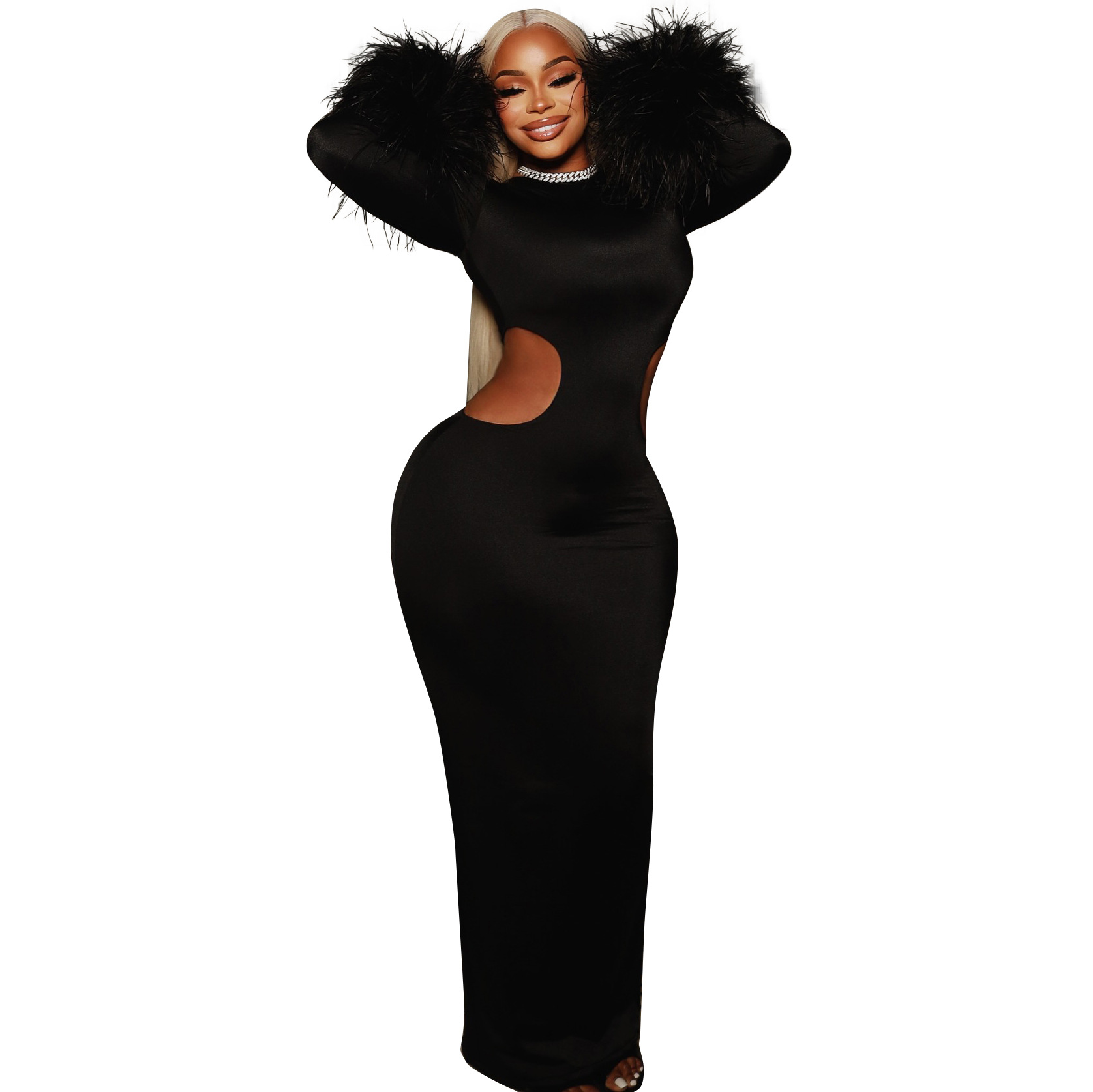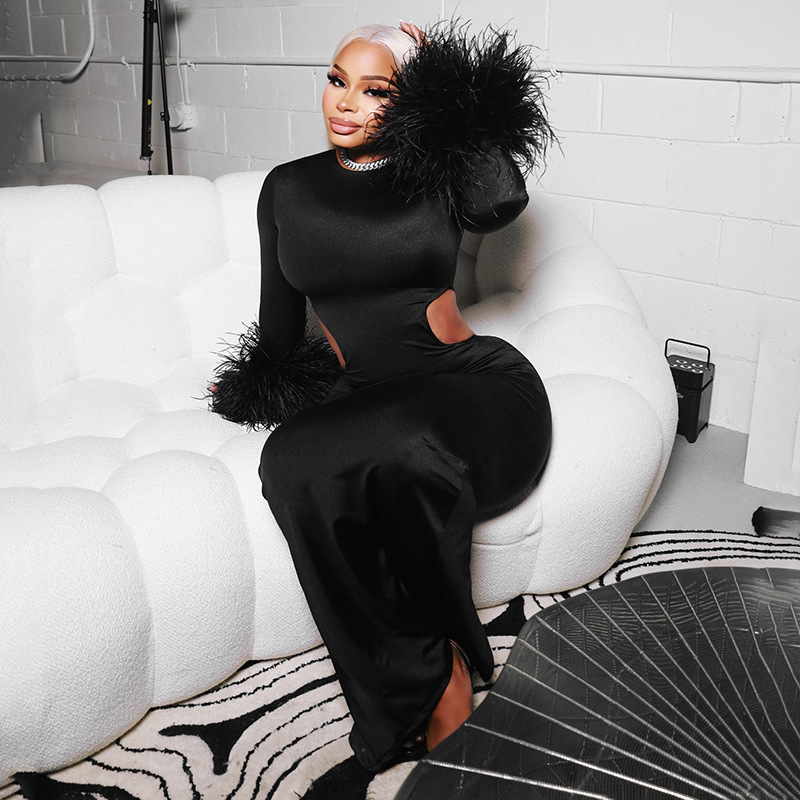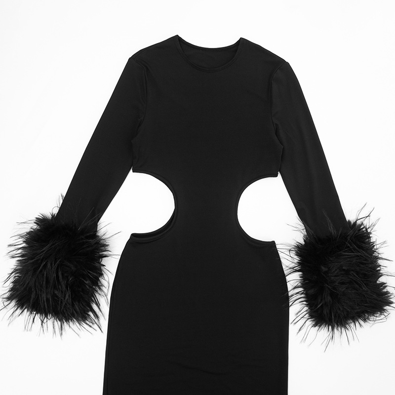 Copy| Product Name | Women Autumn/Winter Round Neck Hollow-Out Furry Patchwork Long Sleeve Bodycon Maxi Dress |