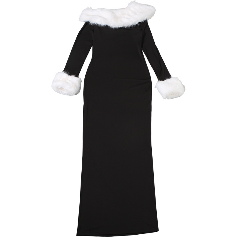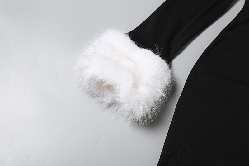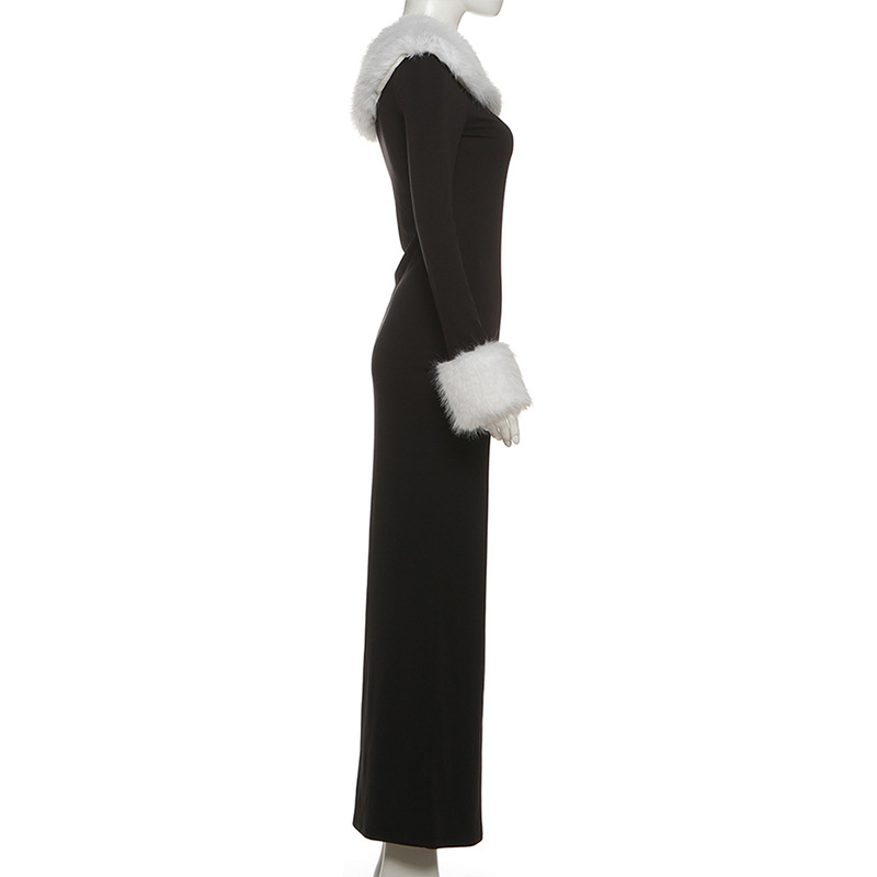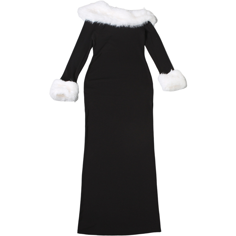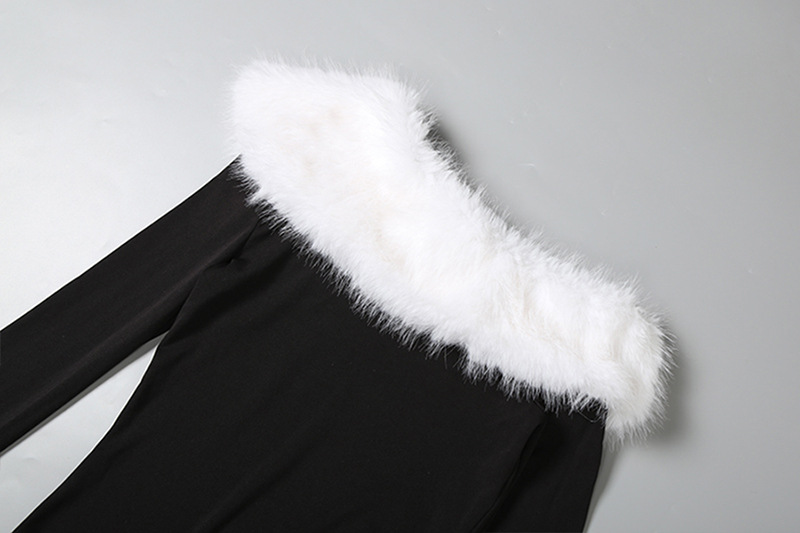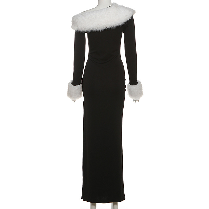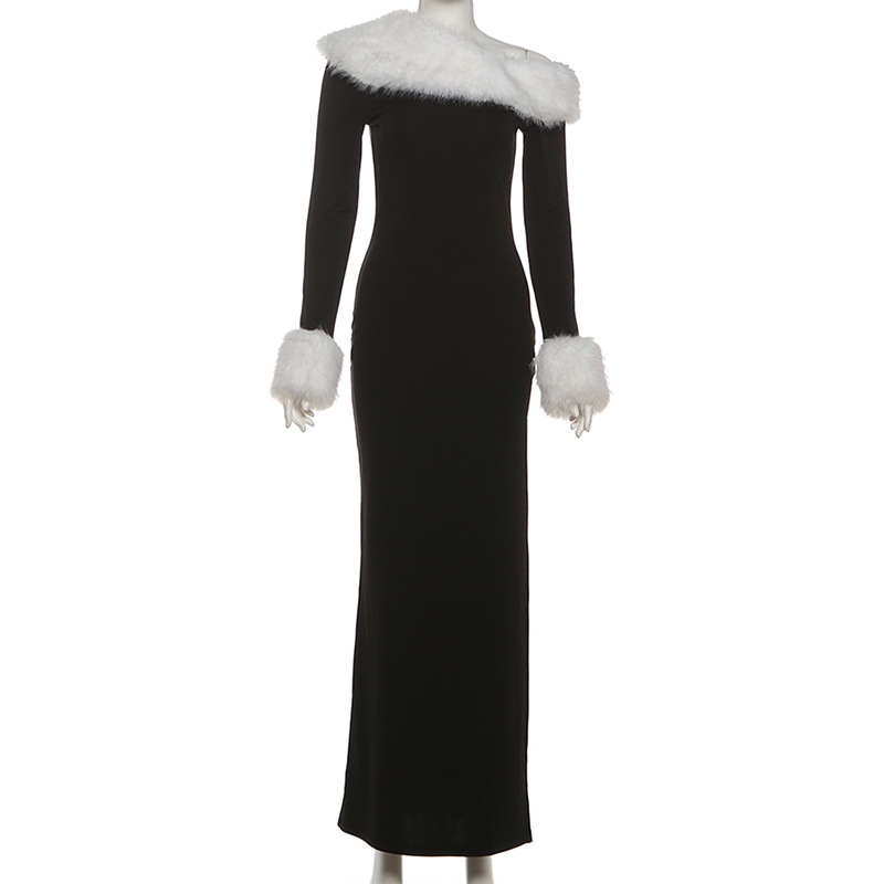 Copy| Product Name | Women Autumn/Winter Sexy Fur Collar Patchwork Slash Shoulder Color Block Long Sleeve Dress |