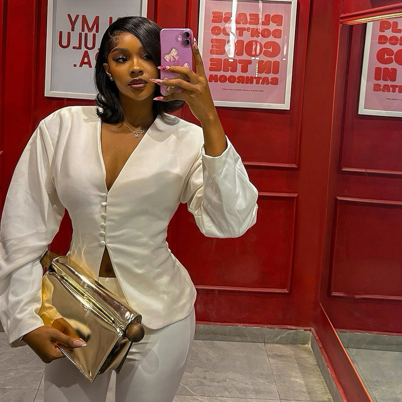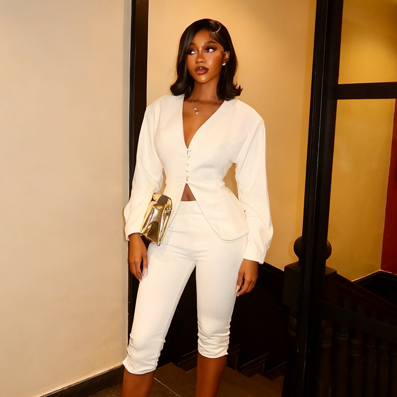 Copy| Product Name | Women Autumn/Winter V-Neck Button-Up Solid Blazer Cropped Pants Two-Piece Set |