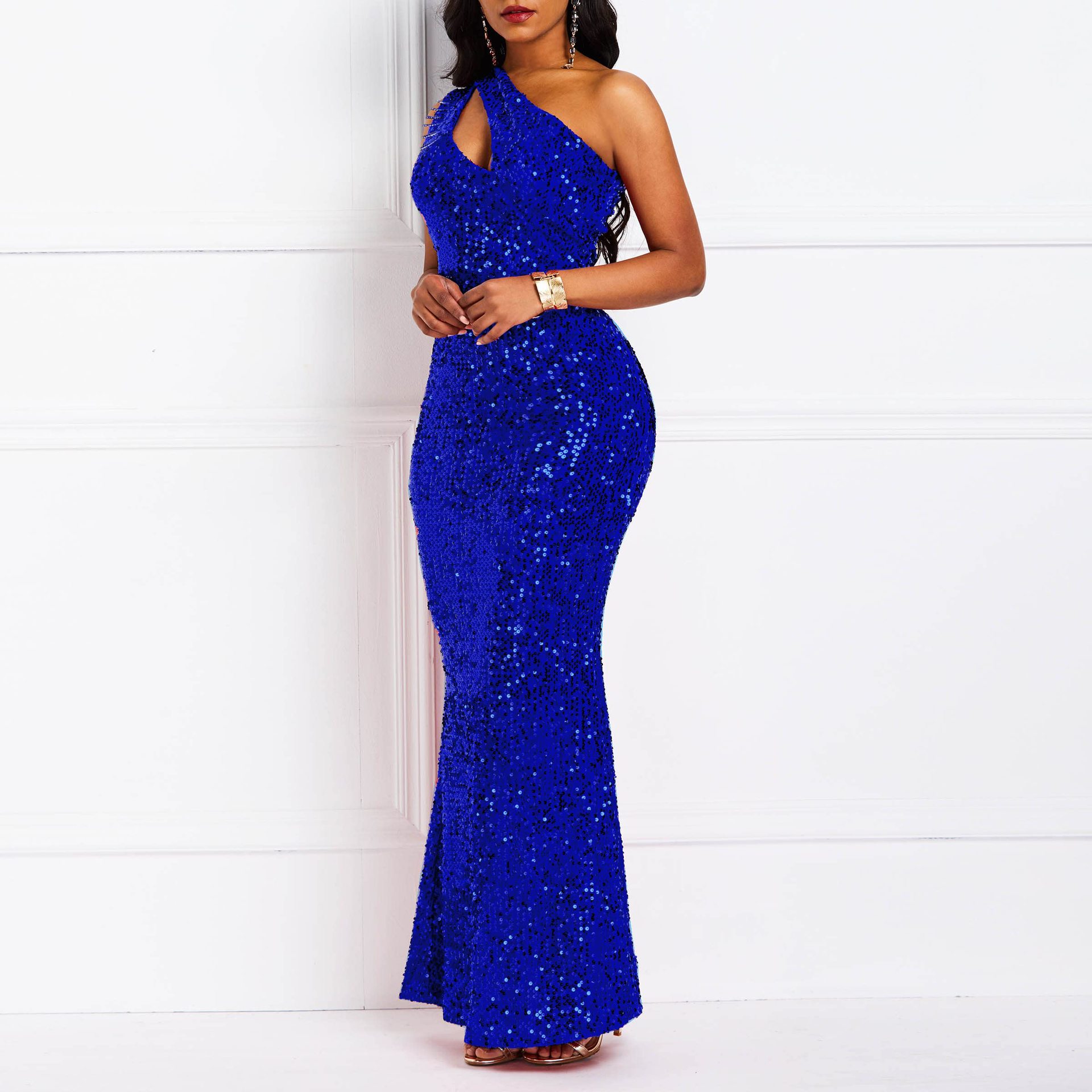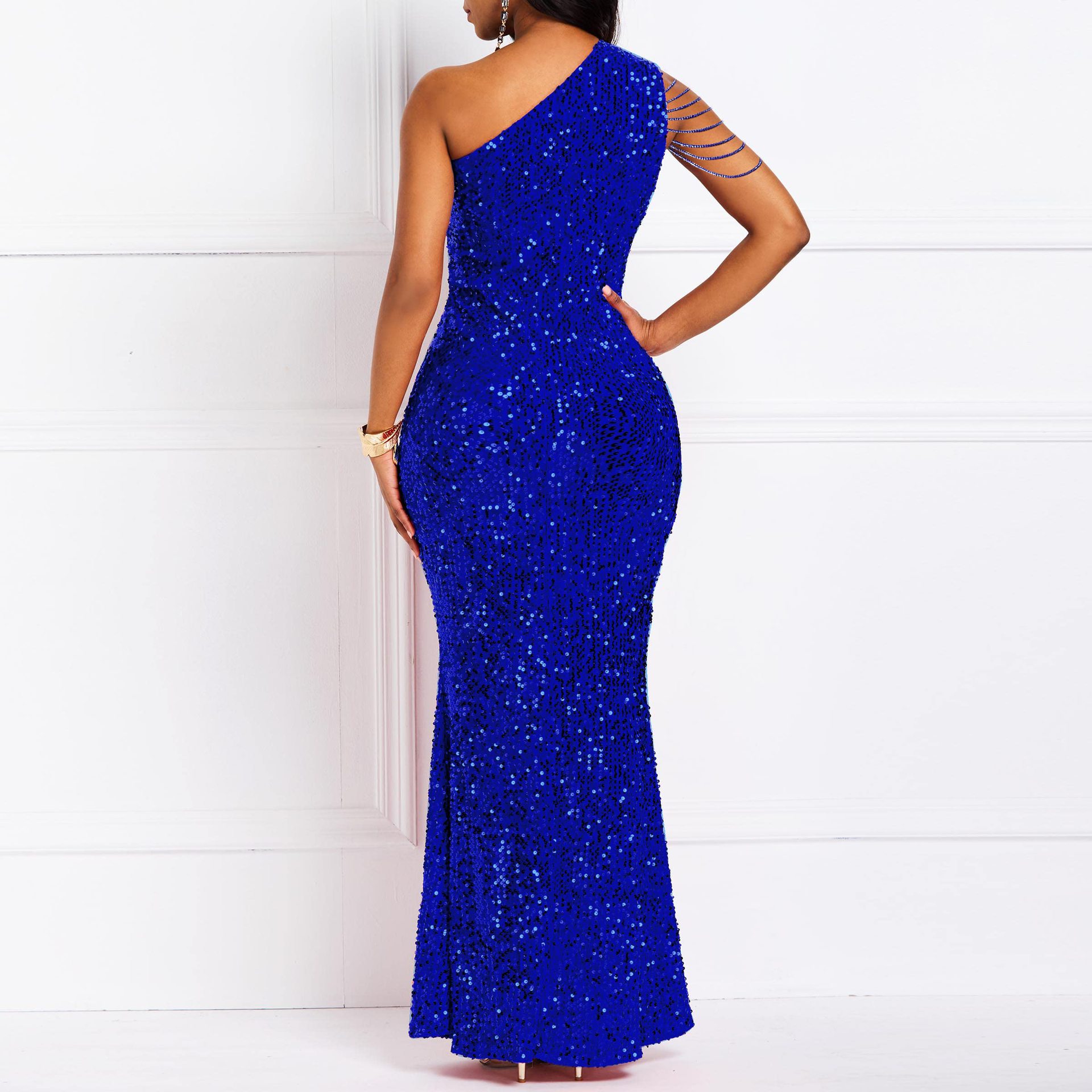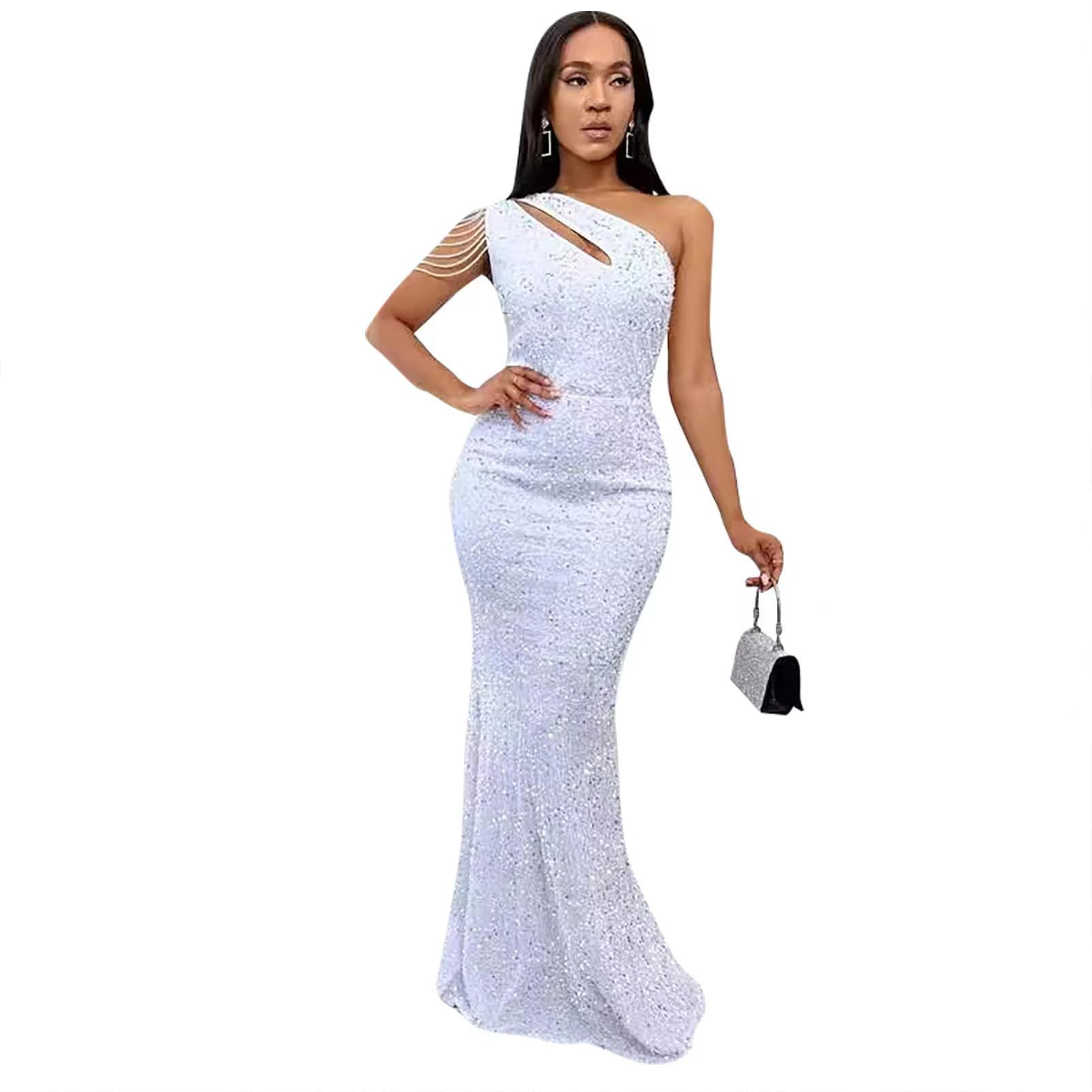 Copy| Product Name | Women Beaded One-Shoulder Solid Backless Mermaid Sequin Dress |