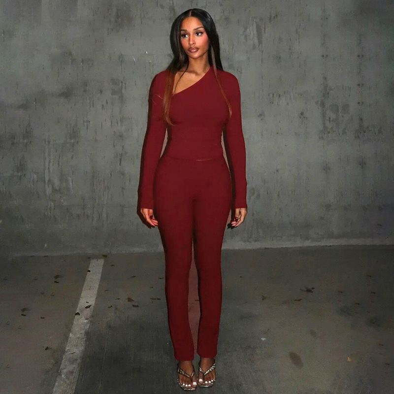 Copy| Product Name | Women Casual Women Asymmetrical V-Neck Long Sleeve Top and Trousers Two-Piece Set |