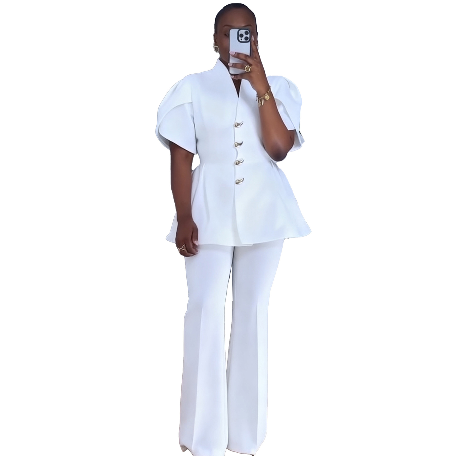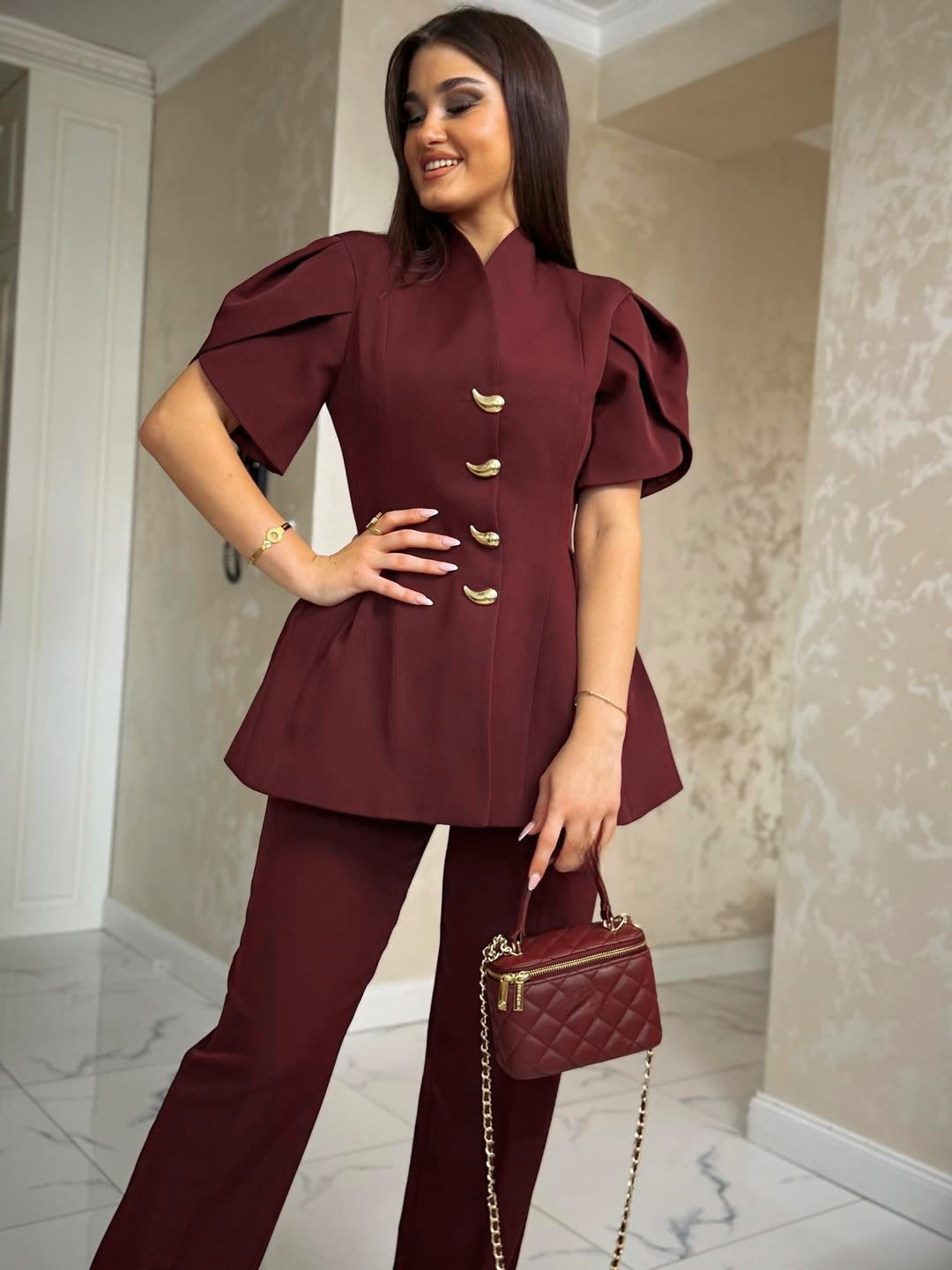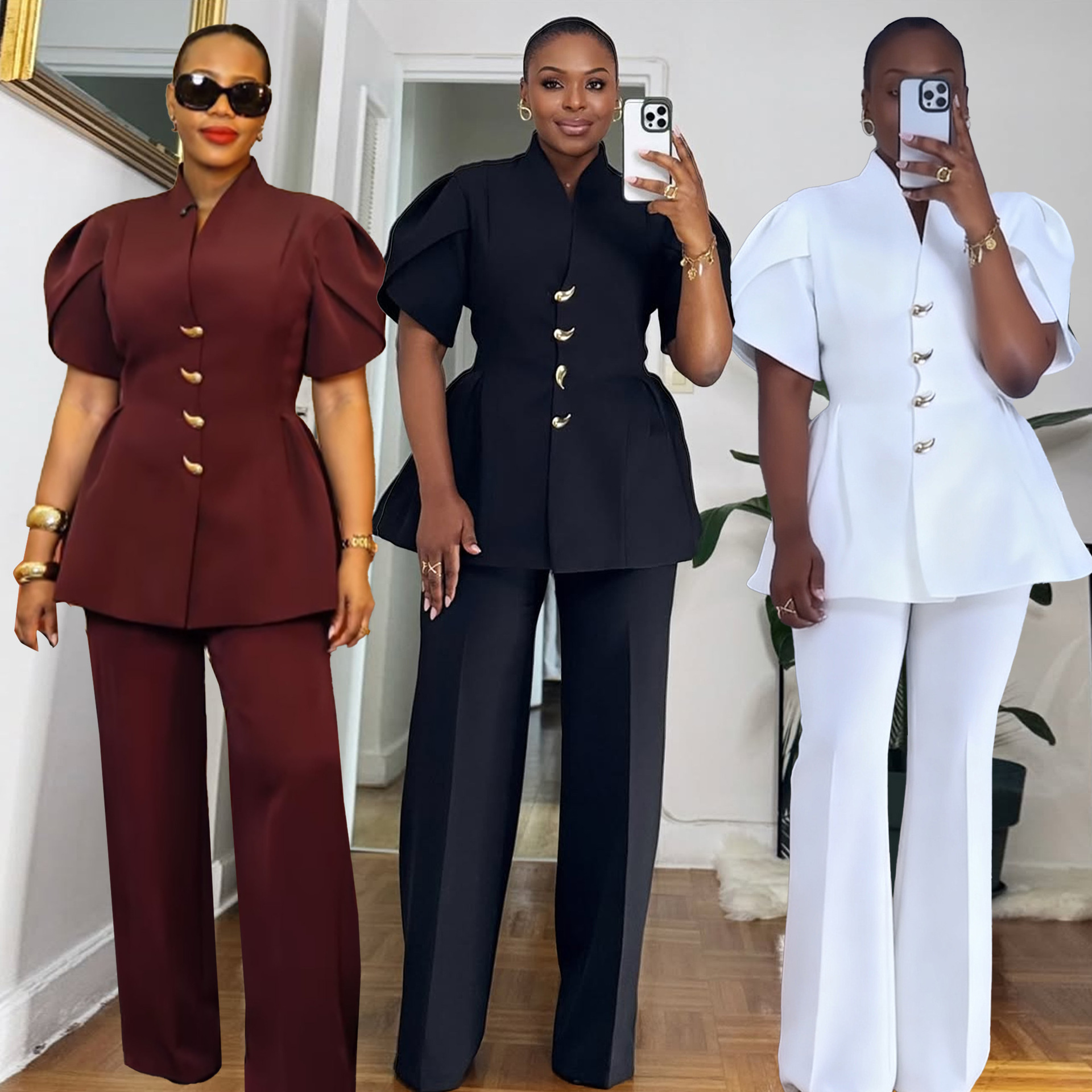 Copy| Product Name | Women Elegant Puff Sleeve Button Top and Pant Two-Piece Set |