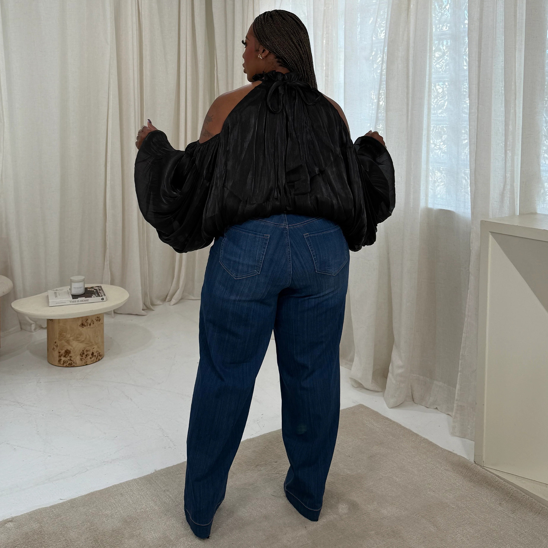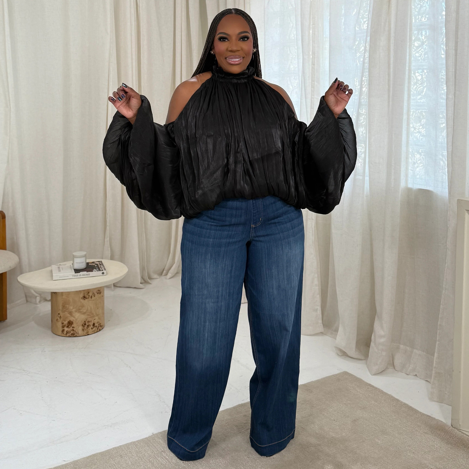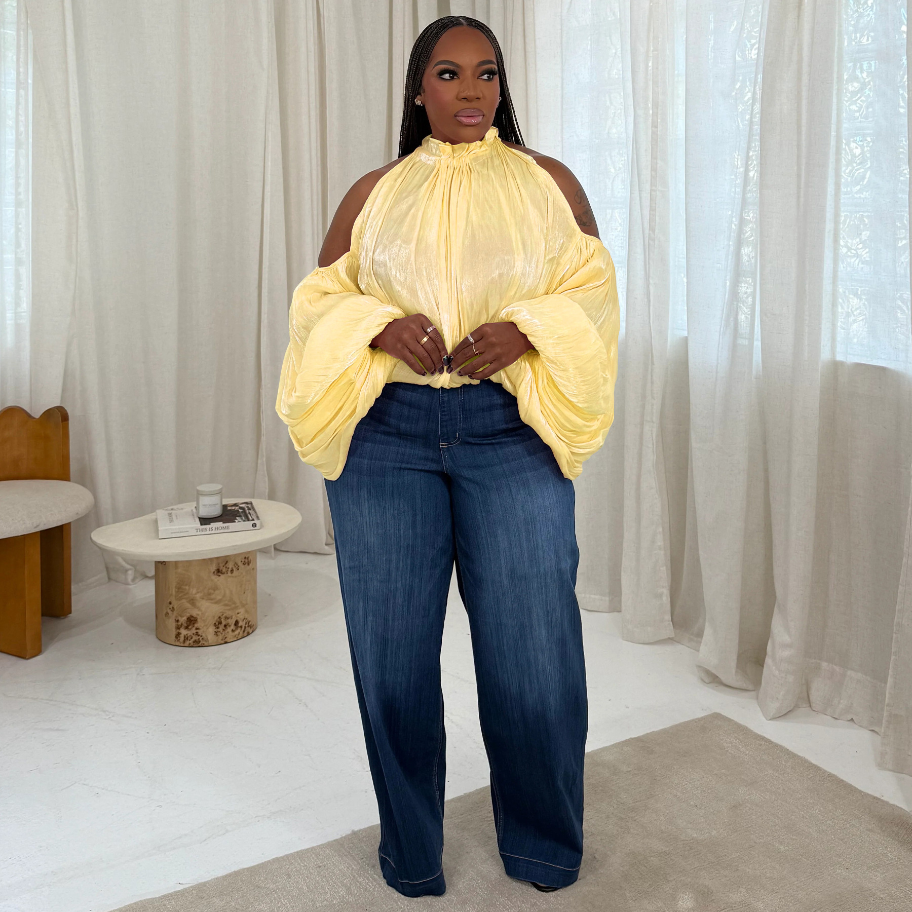 Copy| Product Name | Women Fall Lace-Up Off-Shoulder Lantern Sleeve Top with Chiffon Ties |