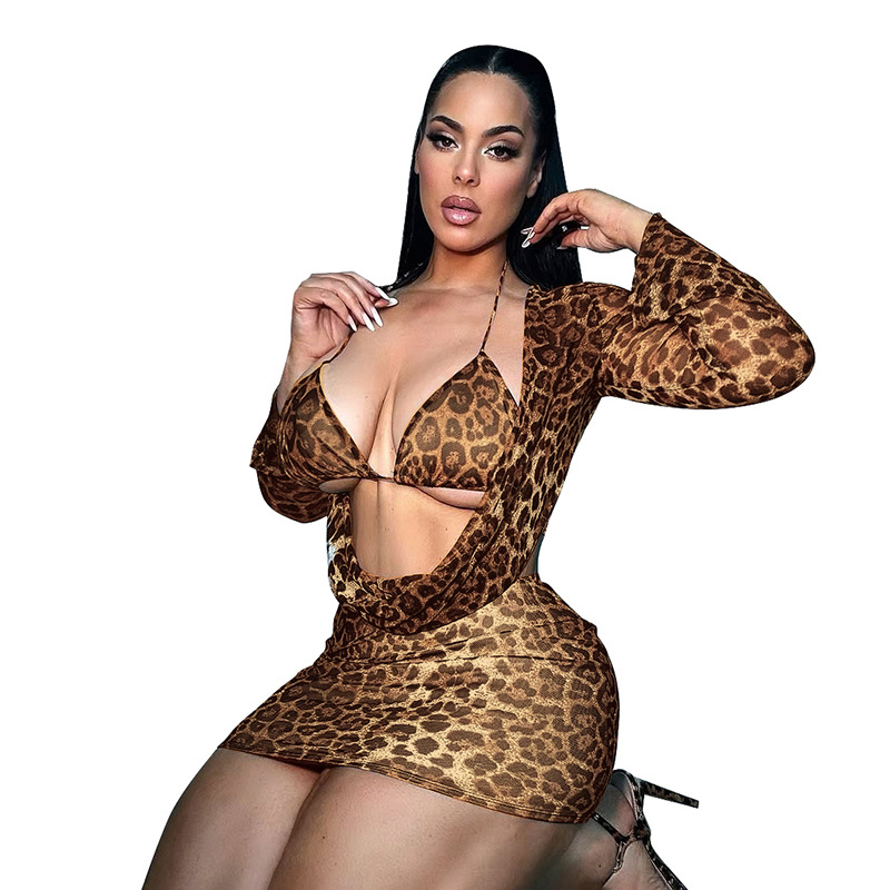 Copy| Product Name | Women Leopard Print Ruffle Collar Bell Bottom Sleeve Top Bra and Skirt Three-Piece |