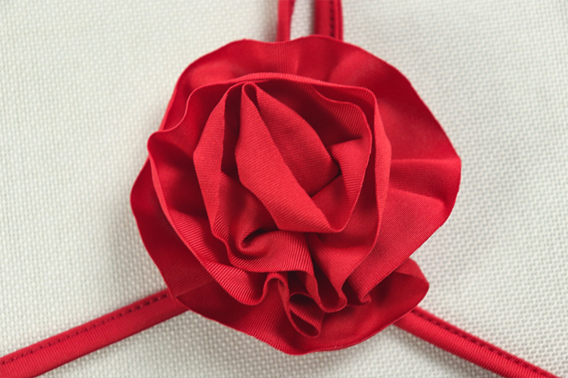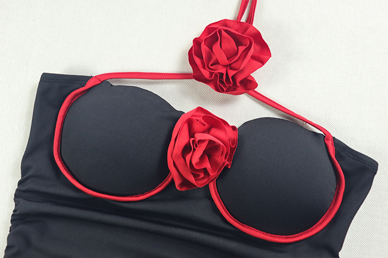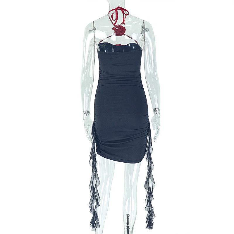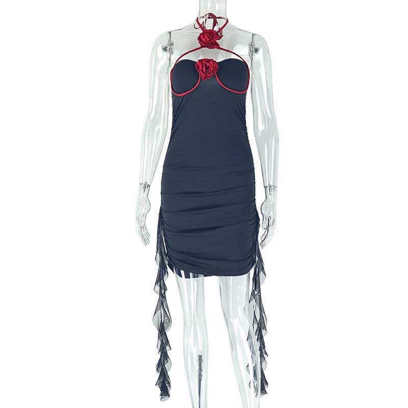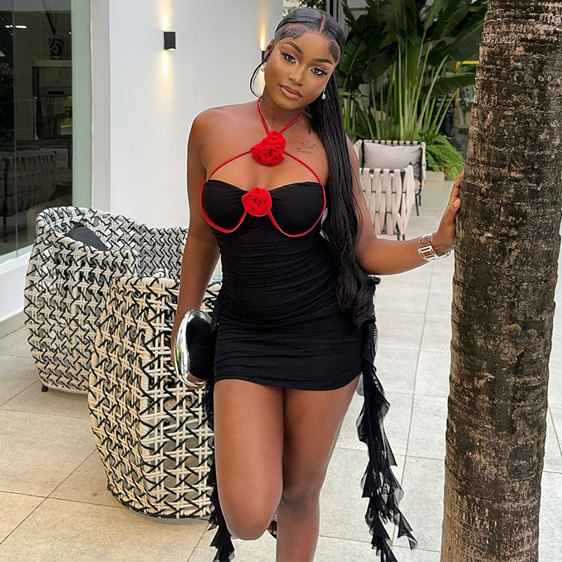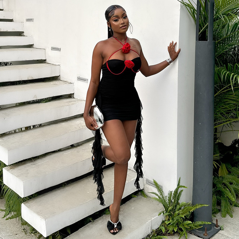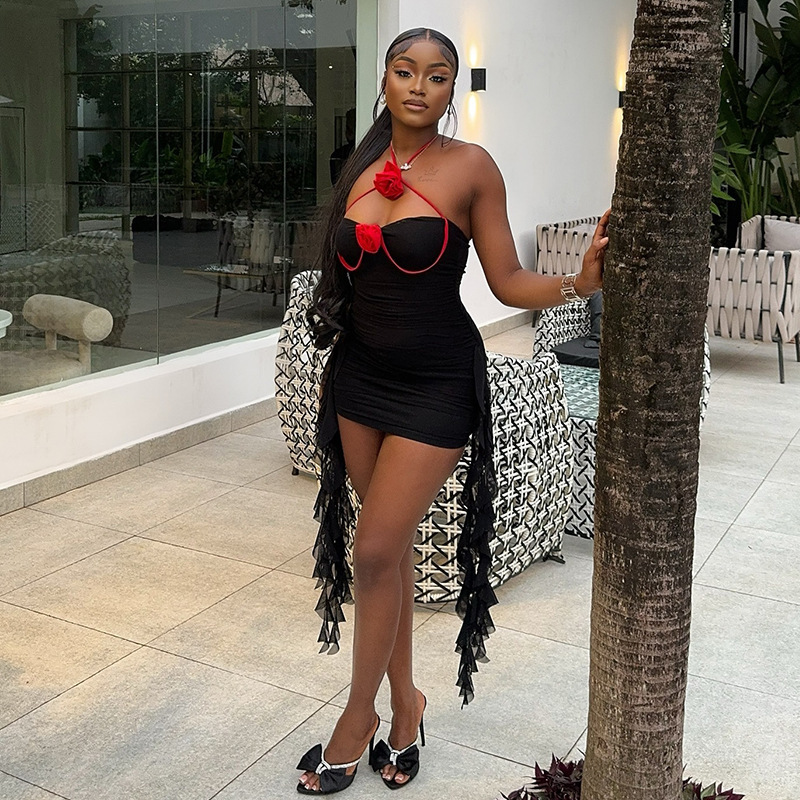Copy| Product Name | Women Sexy Bandeau Dress with Patchwork Halter Neck Red Flower Ruffles |