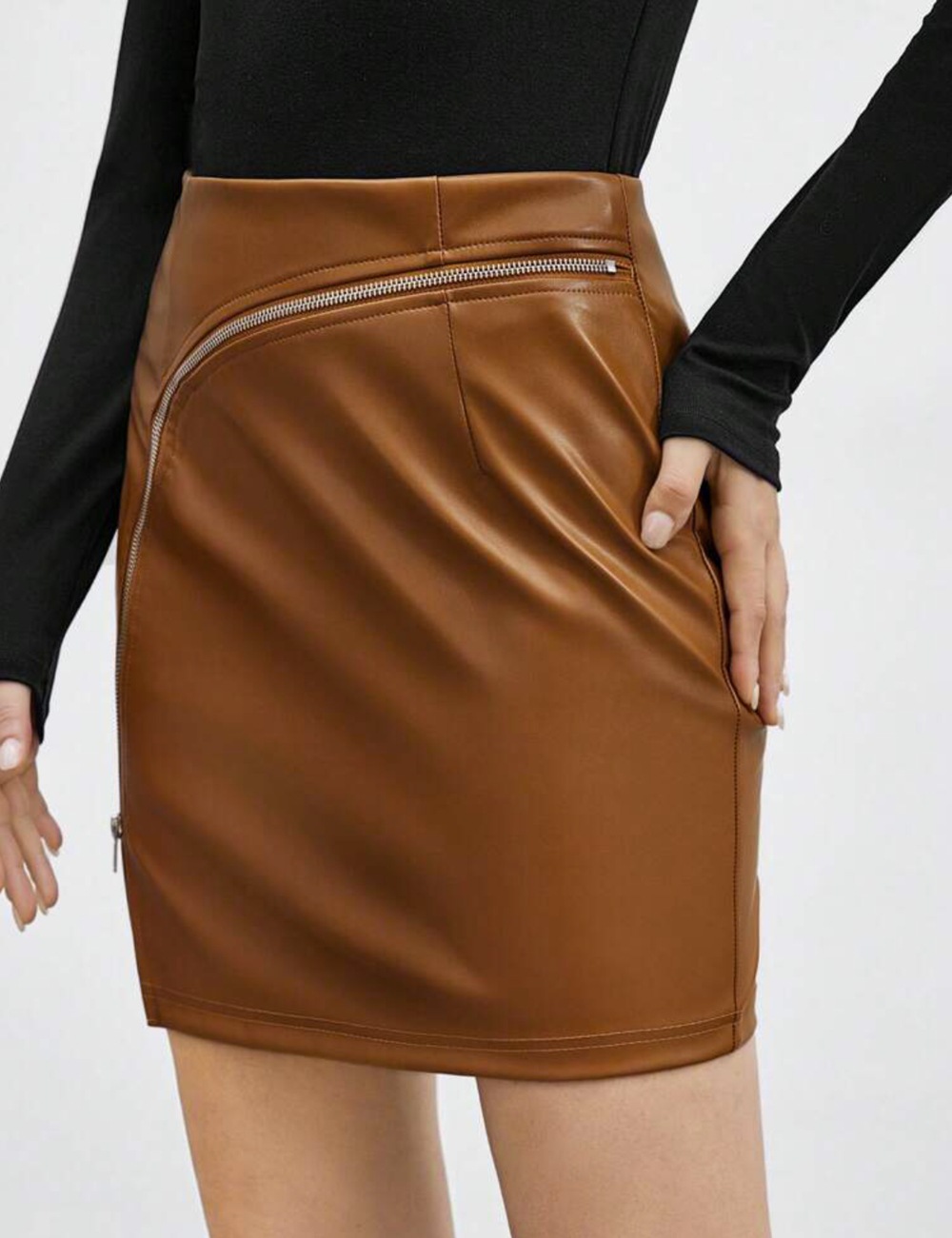 Copy| Product Name | Women Slim Waist Patchwork Zip Split Solid PU Bodycon Skirt |