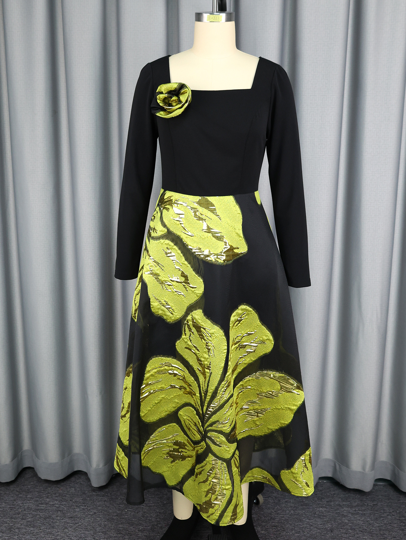 Copy| Product Name | Women Square Neck Long-Sleeved Jacquard Contrast Color Dress |