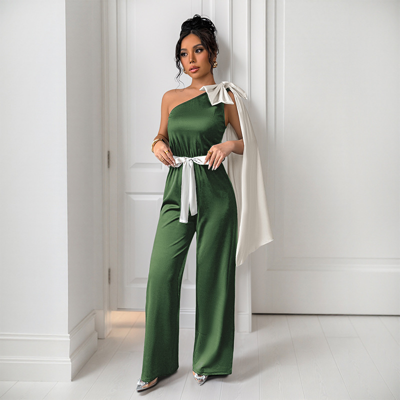Copy| Product Name | Women Summer Color Block Bow Ribbon Slash Shoulder Sleeveless Jumpsuit |