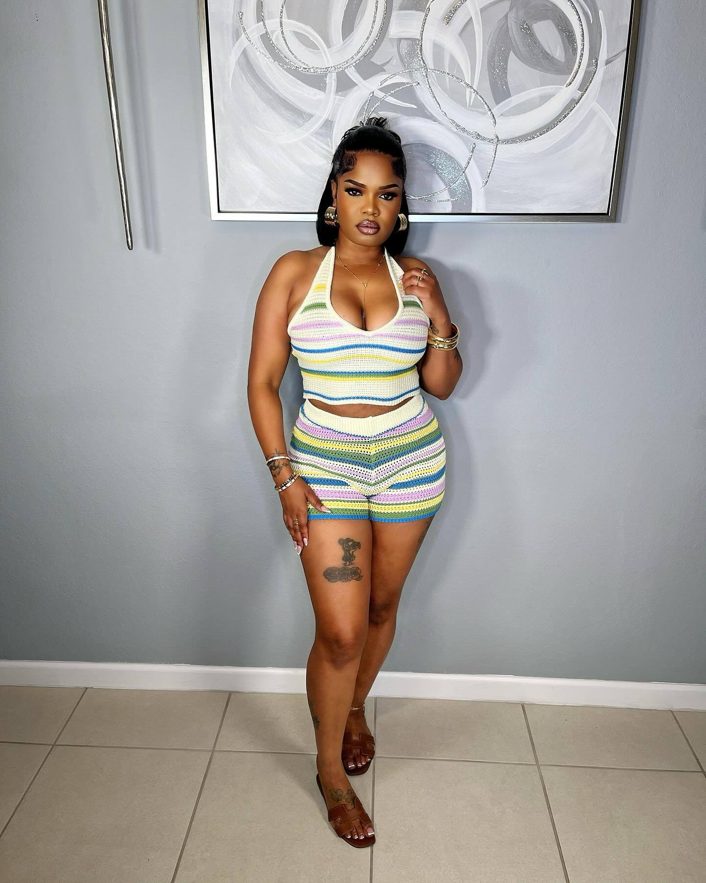 This Women Sweater Backless Halter Neck Top And Shorts Two-Piece Set Design Made Of High Quality Polyster And Spandex Material. It Is Stretchy, Durable And Comfortable. It Come With The Top And Shorts. Wholesale Short Sets Saves Some People From The Trouble Of Matching. And For Matchmakers It Is More Flexible Than One-Piece Outfit. Two Piece Short Set Can Be Worn Together Or Individually, Ladies Can Match Them According To Different Occasions. Grab Different Two Piece Short Sets For This Spring And Summer.
