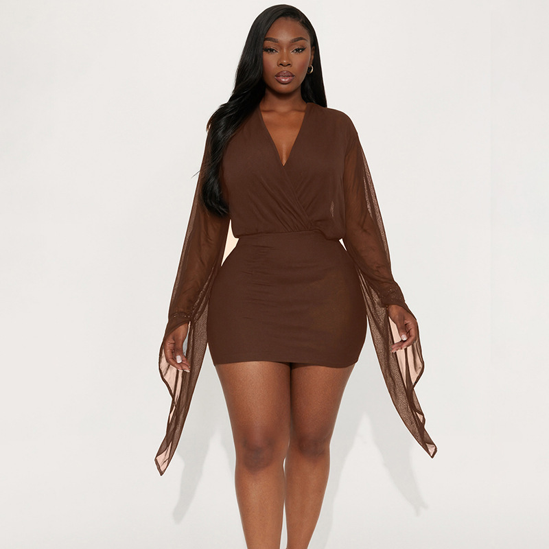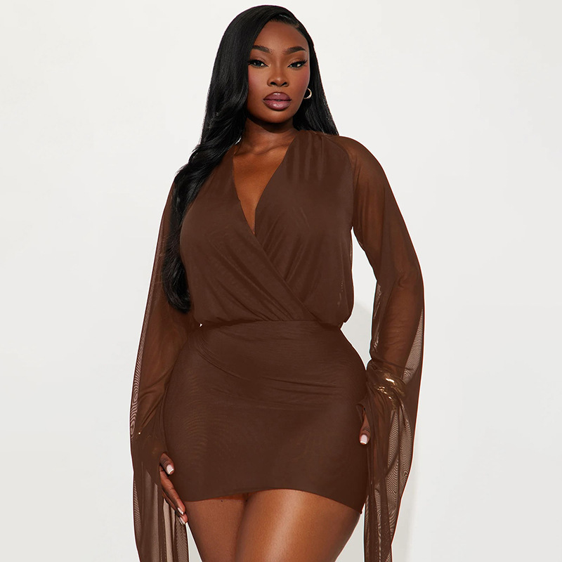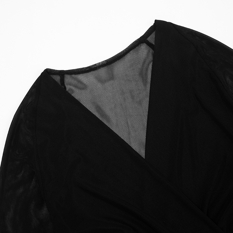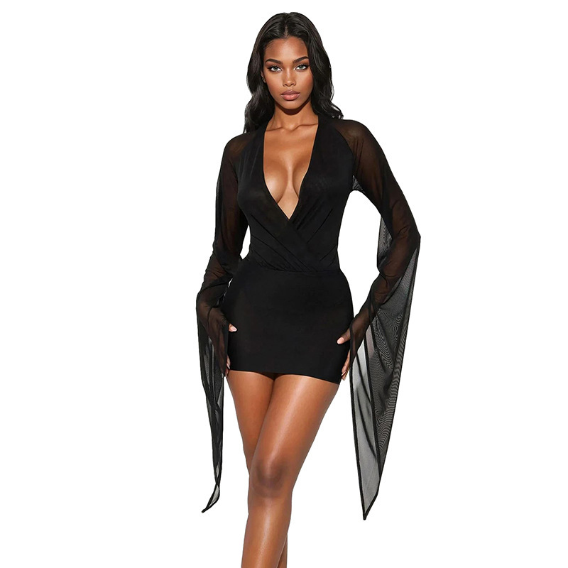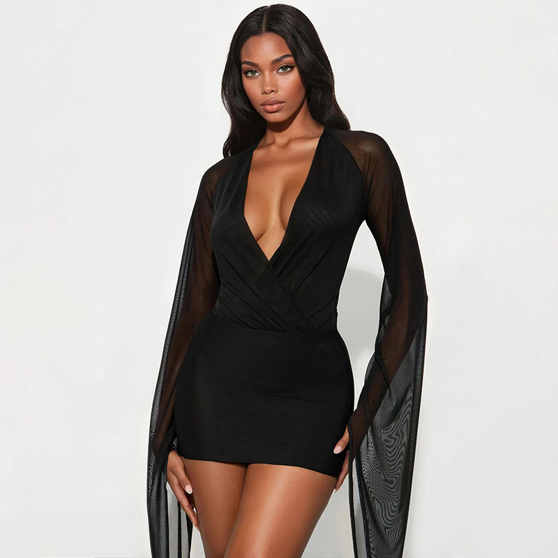 Copy| Product Name | Women Winter Elegant Long-Sleeved V-Neck Mesh Mini Bodycon Dress |