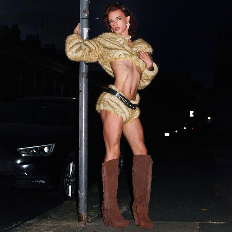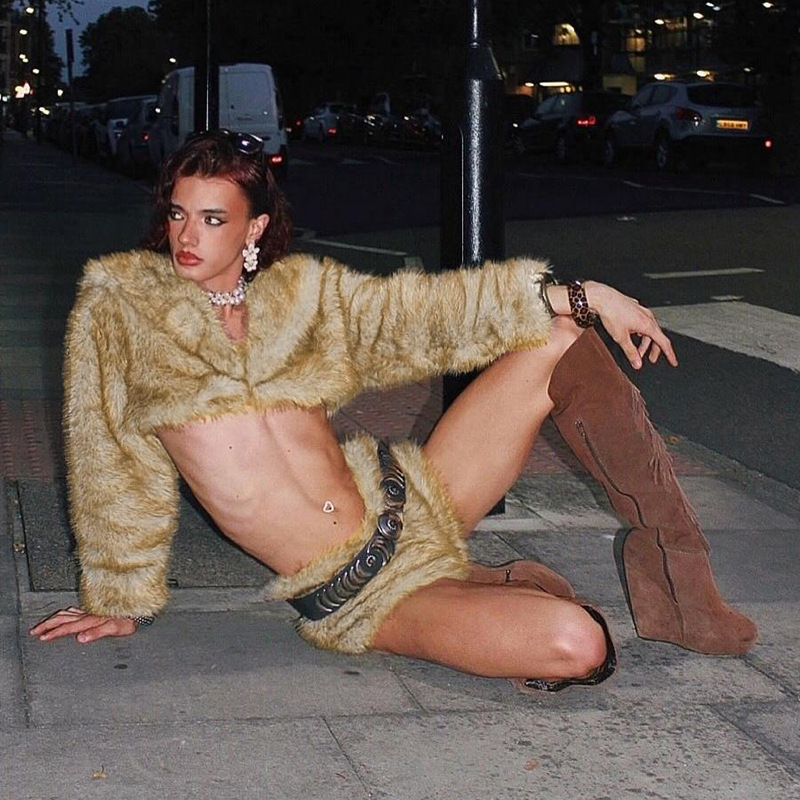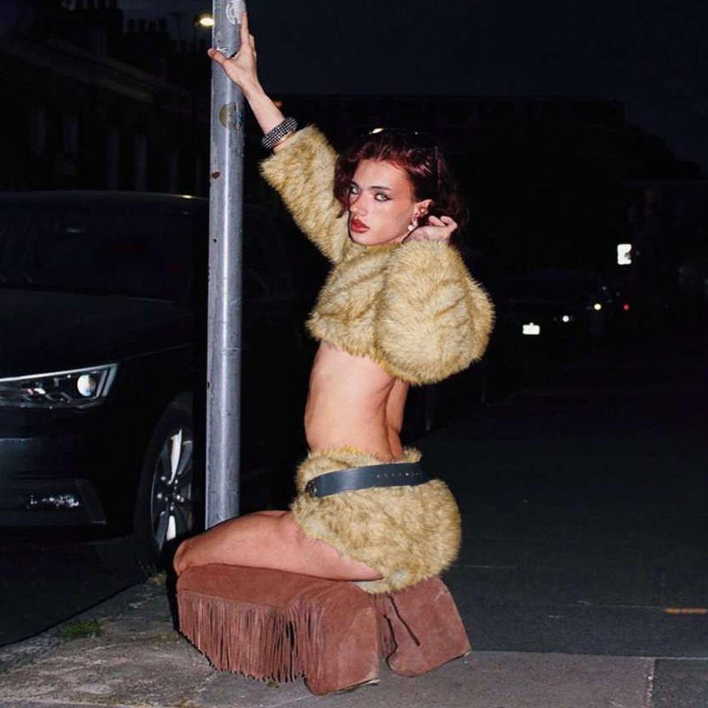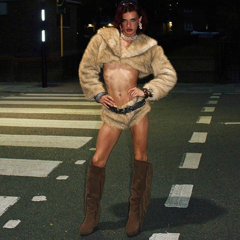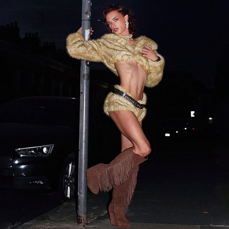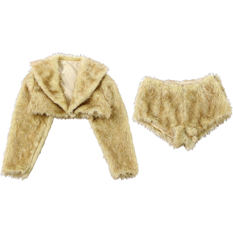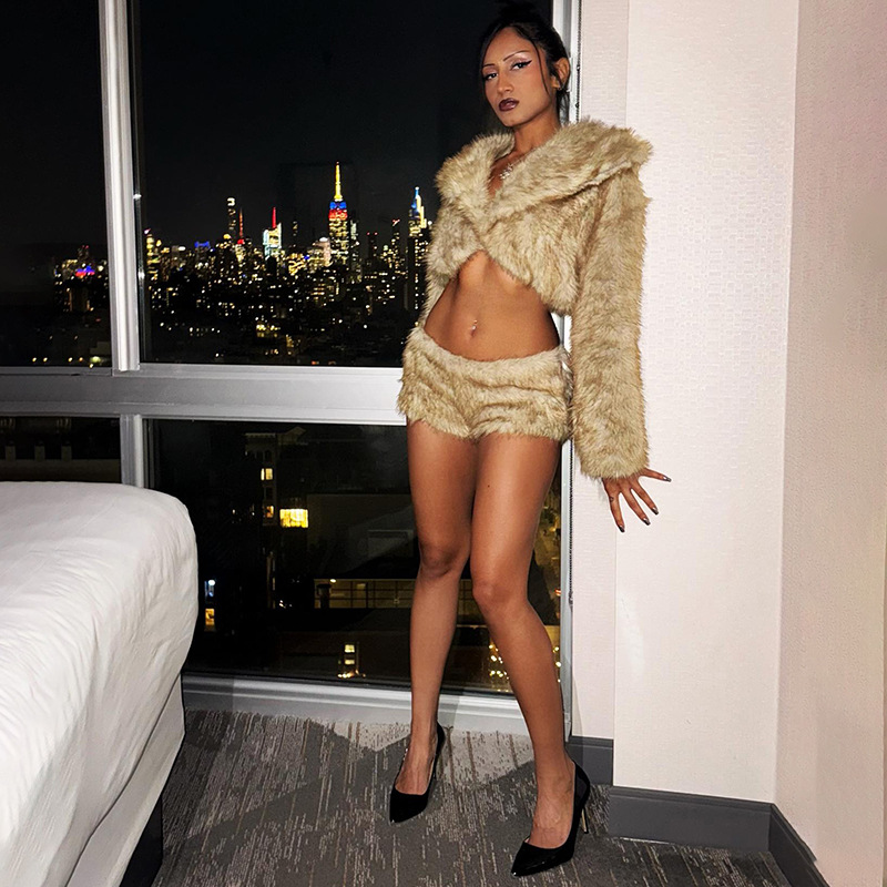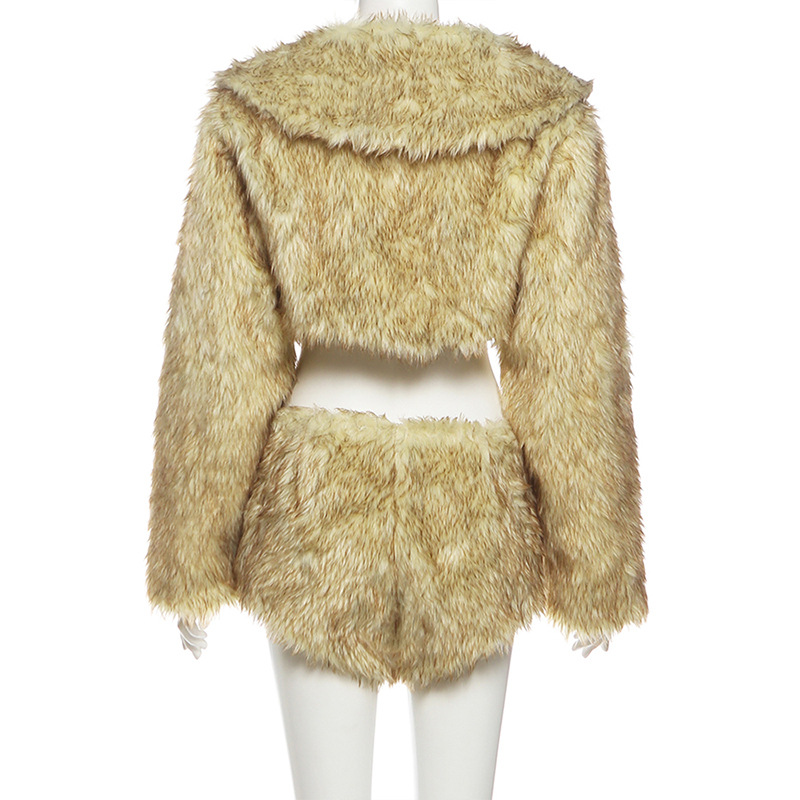 Copy| Product Name | Women Winter Sexy Fur Turndown Collar Crop Top Shorts Two-Piece Set |