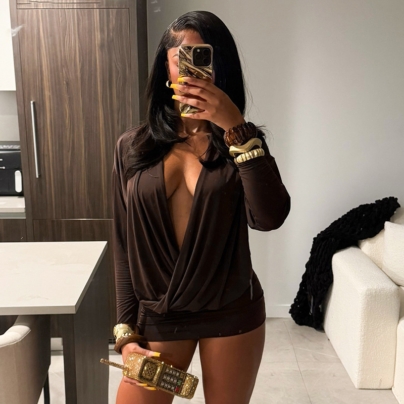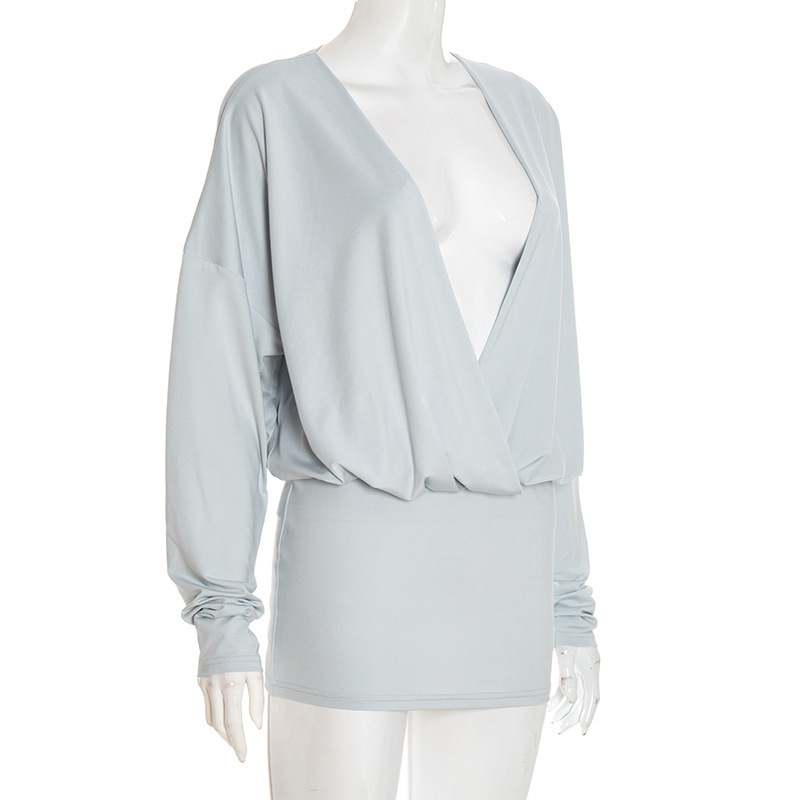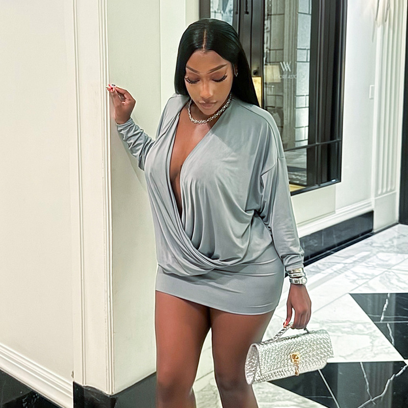 Copy| Product Name | Women's Autumn Winter Solid Fashion Deep V Long Sleeve Slim Waist Bodycon Dress |