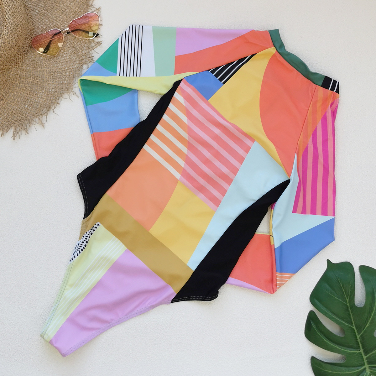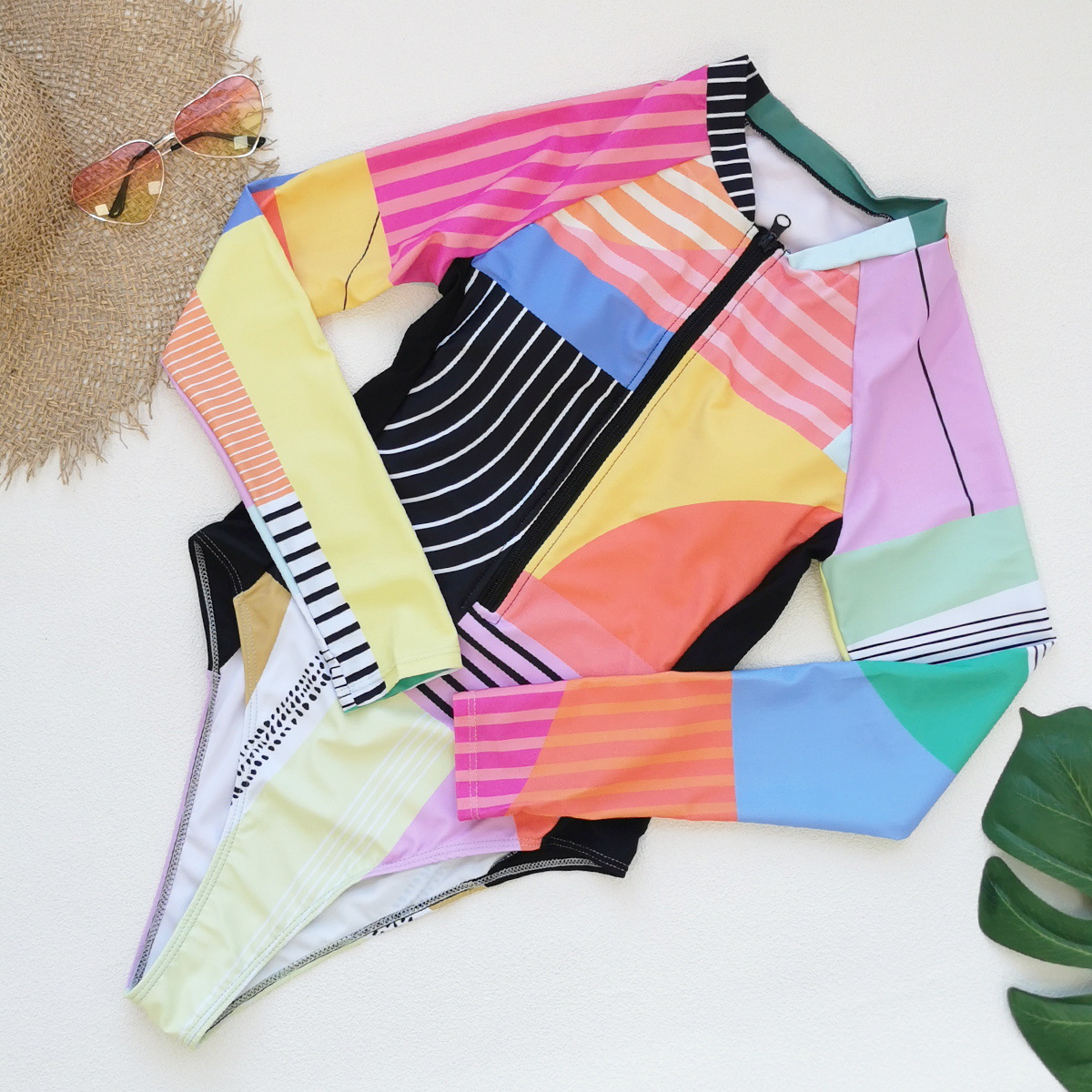 Copy| Product Name | Women's Colorblock Long Sleeve Zip-Up High-Slit Triangle One-Piece Swimsuit |