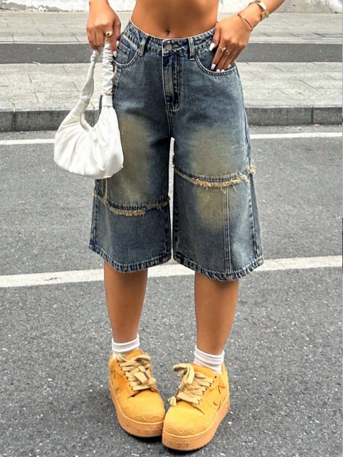 Copy| Product Name | Women's Distressed Patchwork Frayed Hem Loose Straight Leg Denim Shorts |