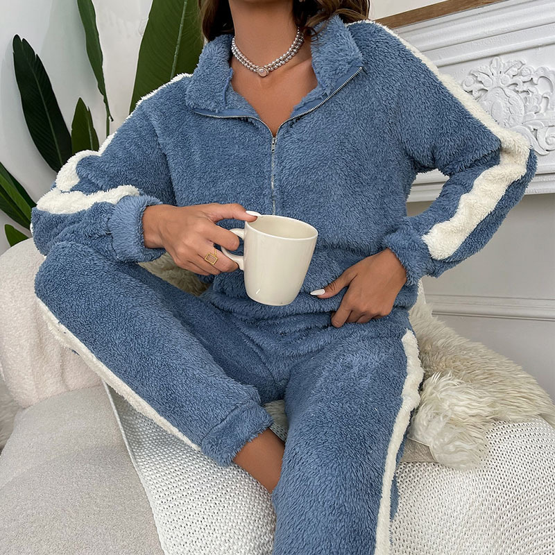 Copy| Product Name | Women's Fall/Winter Coral Fleece Stand Collar Zip Casual Long Sleeve Pajama Set |