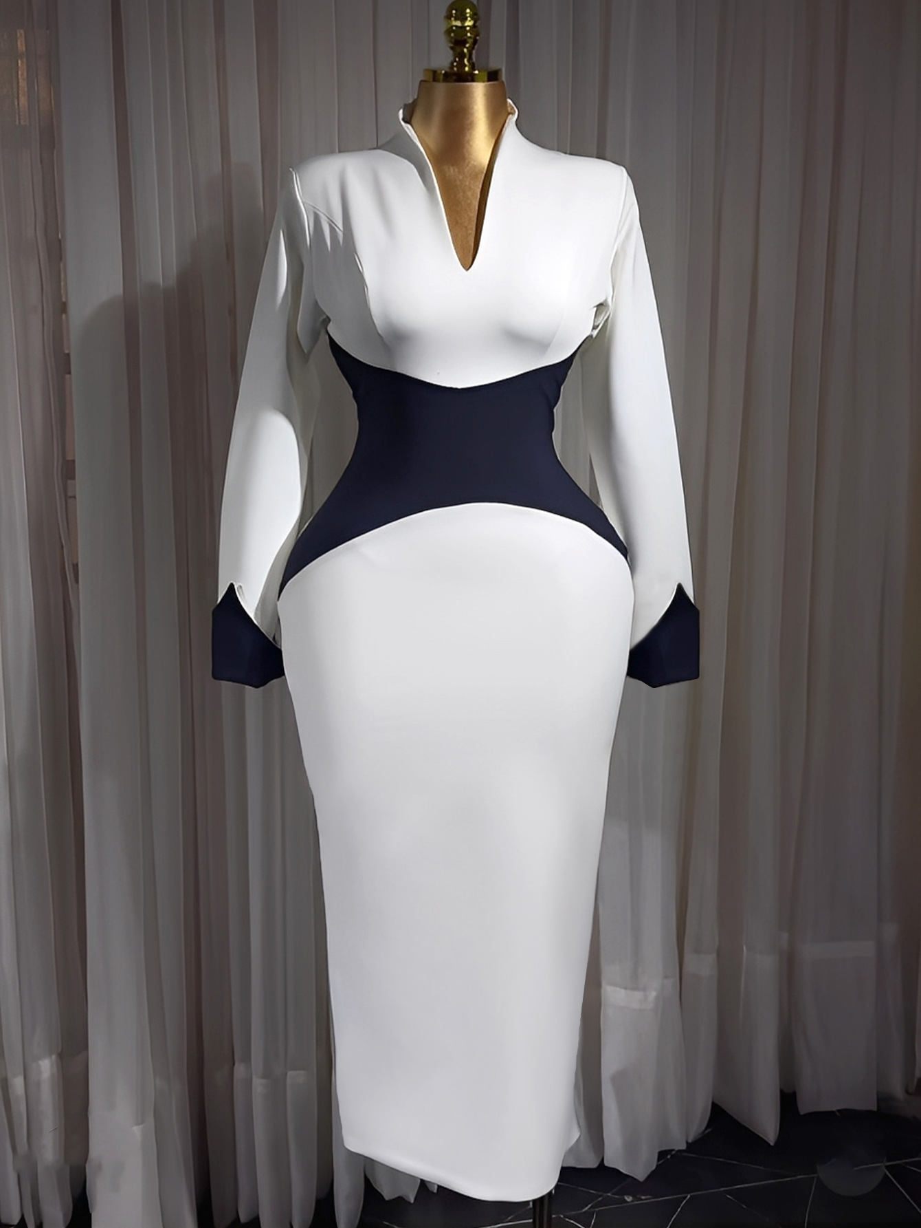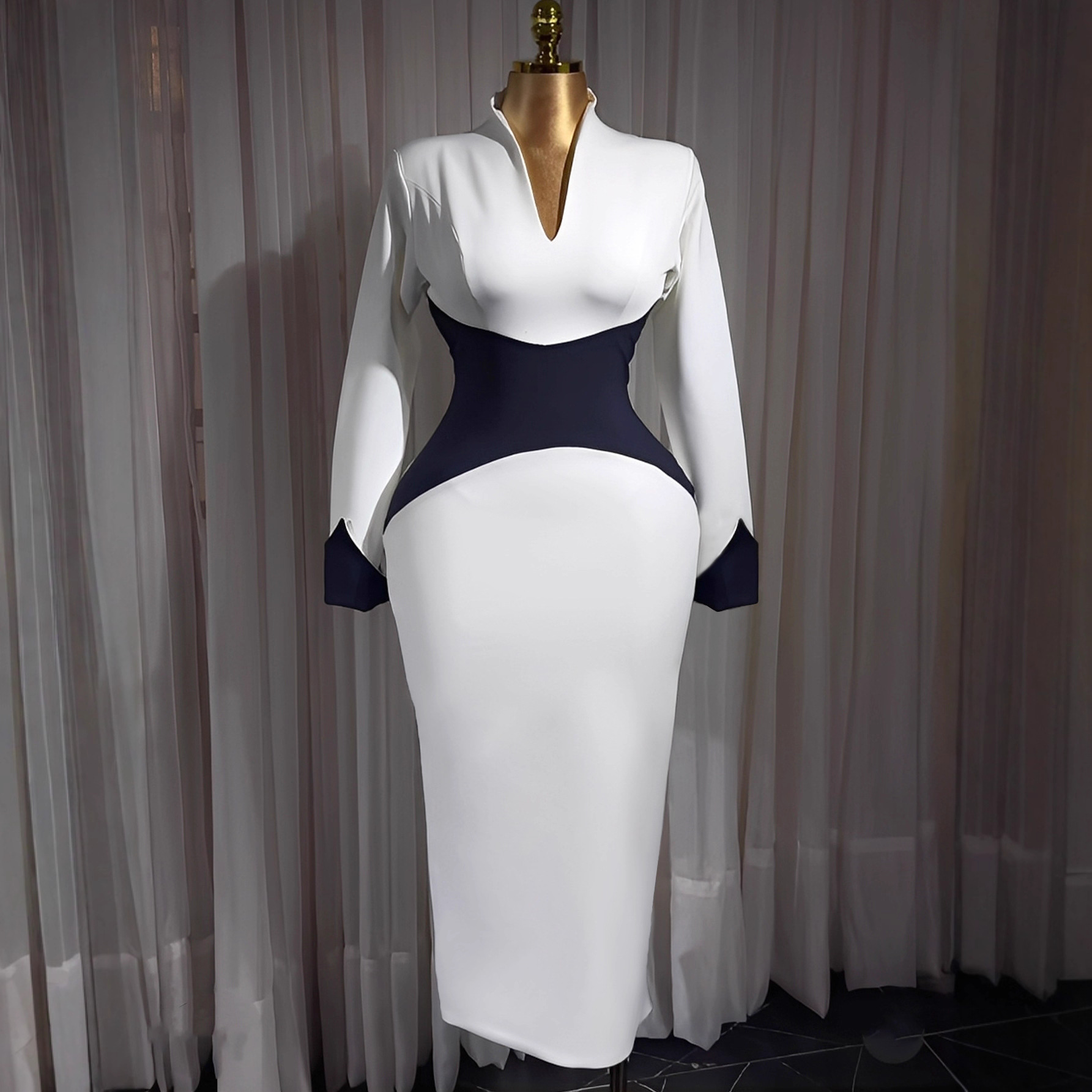Copy| Product Name | Women's Fashion Deep V Contrast Color Long Sleeve Slim Waist Slim Fit Bodycon Party Evening Dress |