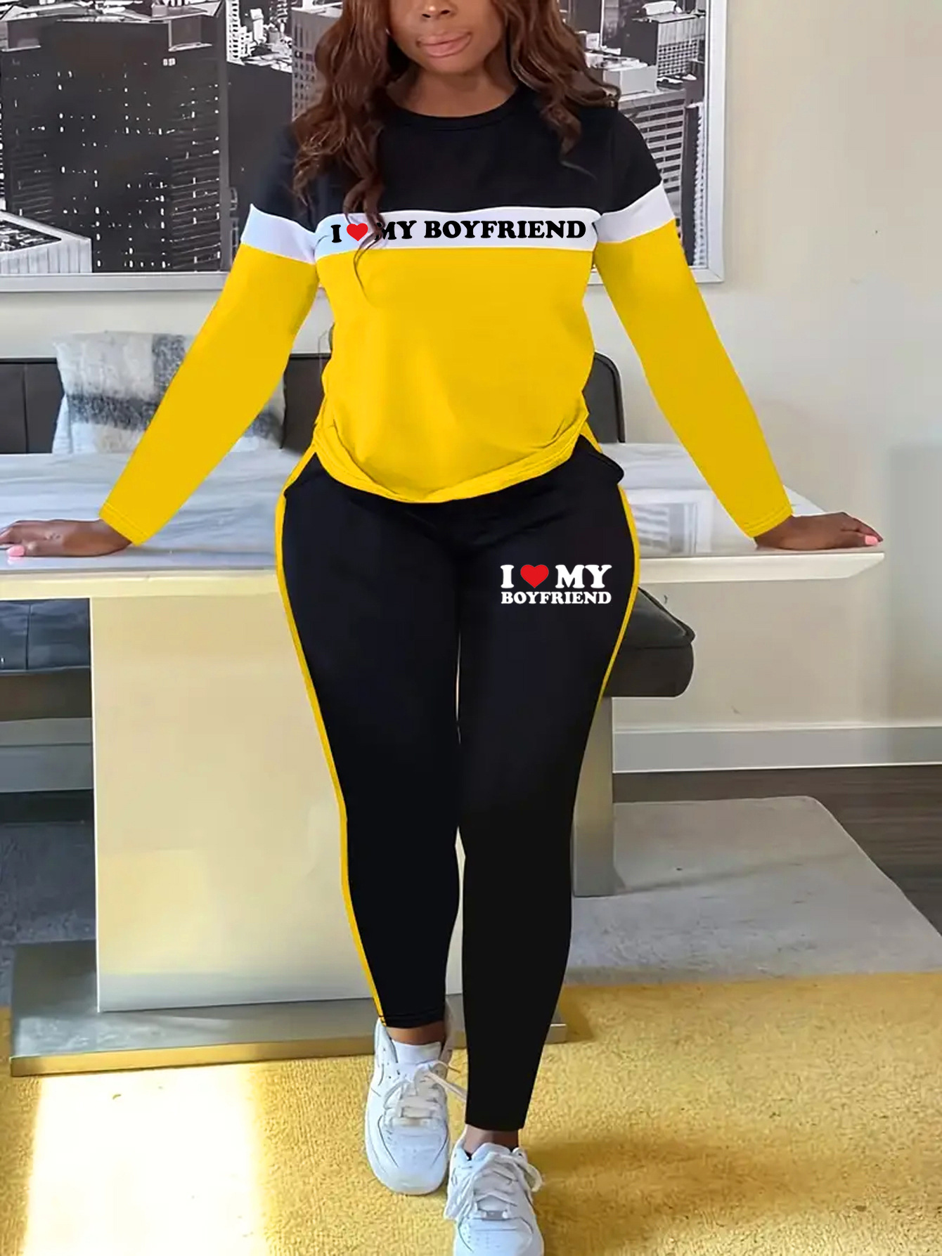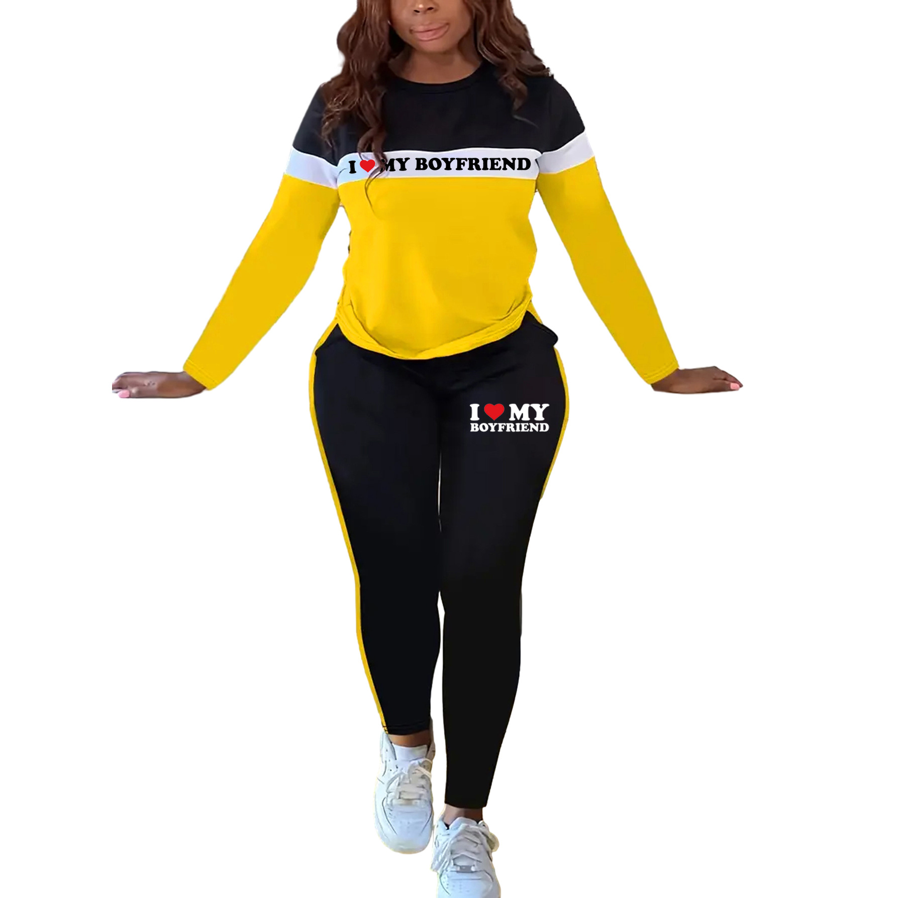 Copy| Product Name | Women's Fashion Patchwork Letter Print Round Neck Long Sleeve Two Piece Pants Set |