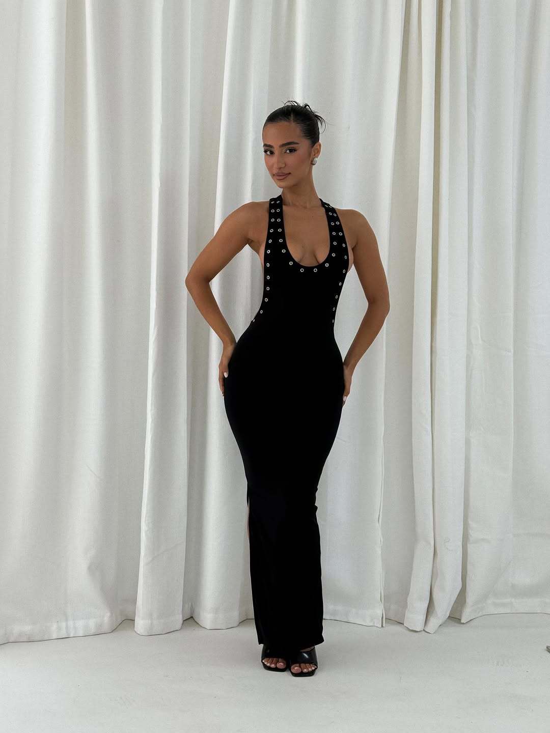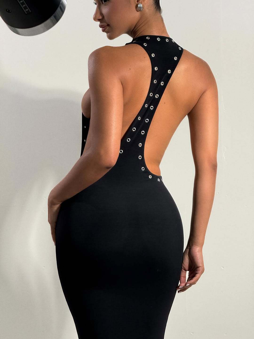 Copy| Product Name | Women's Fashion Sexy Halter Hollow-Out Slim Waist Low Back Bodycon Slit Solid Color Long Dress |