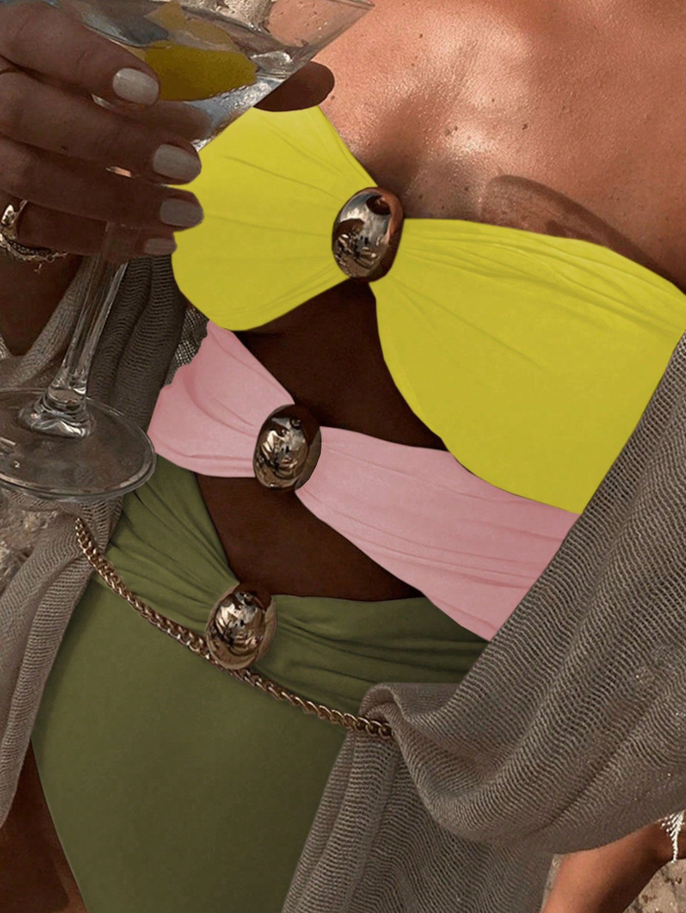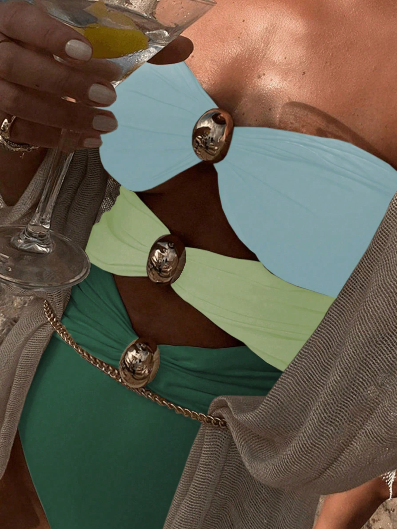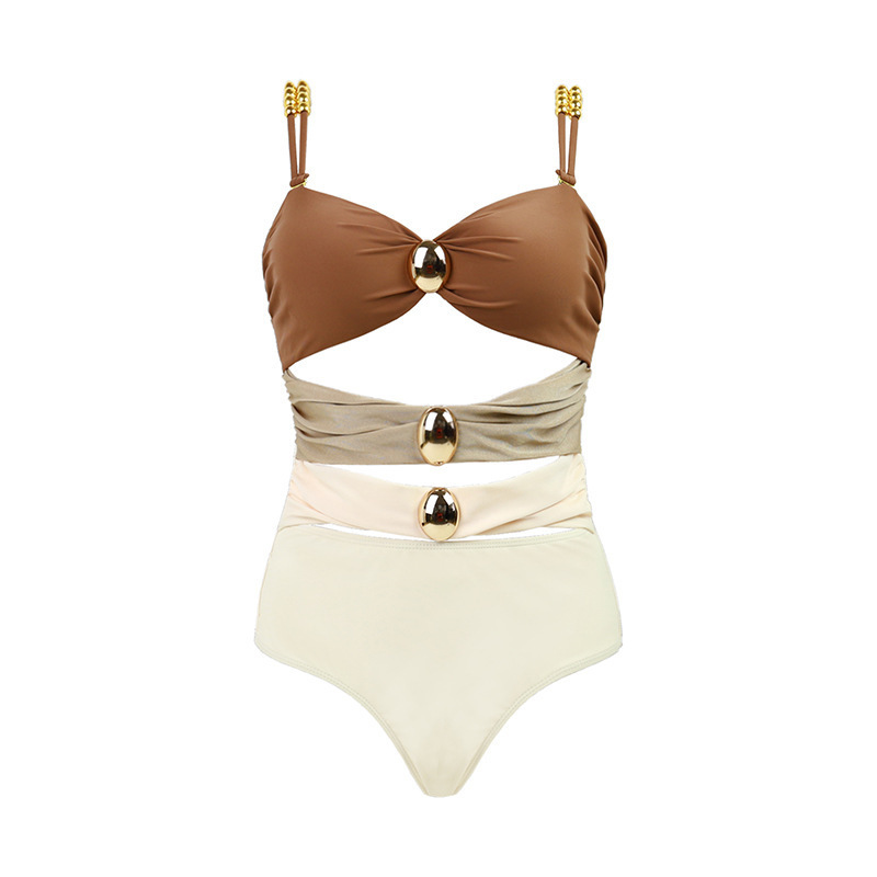 Copy| Product Name | Women's Gold Buttons Color-Blocking Three-Color Sexy One-Piece Swimsuit |