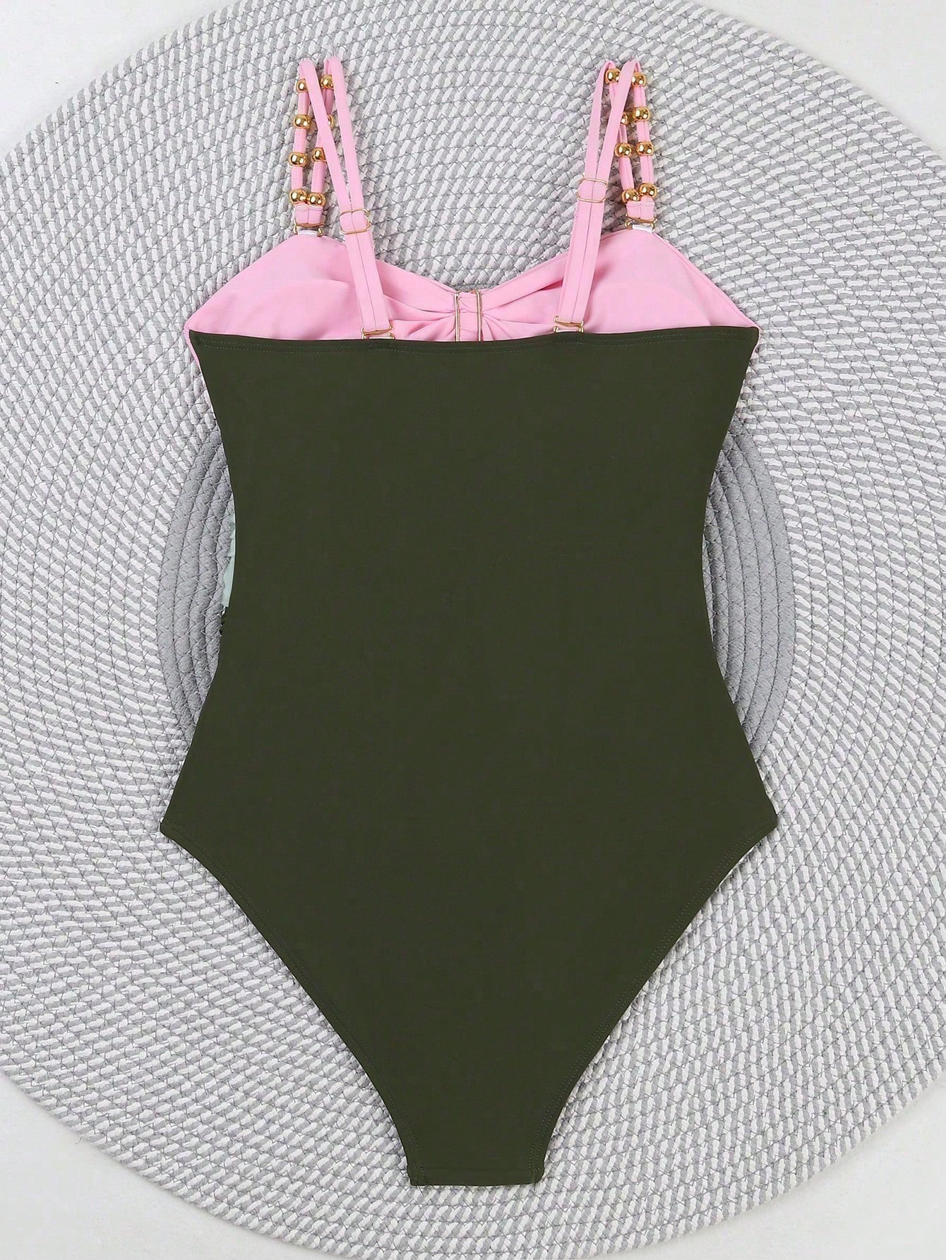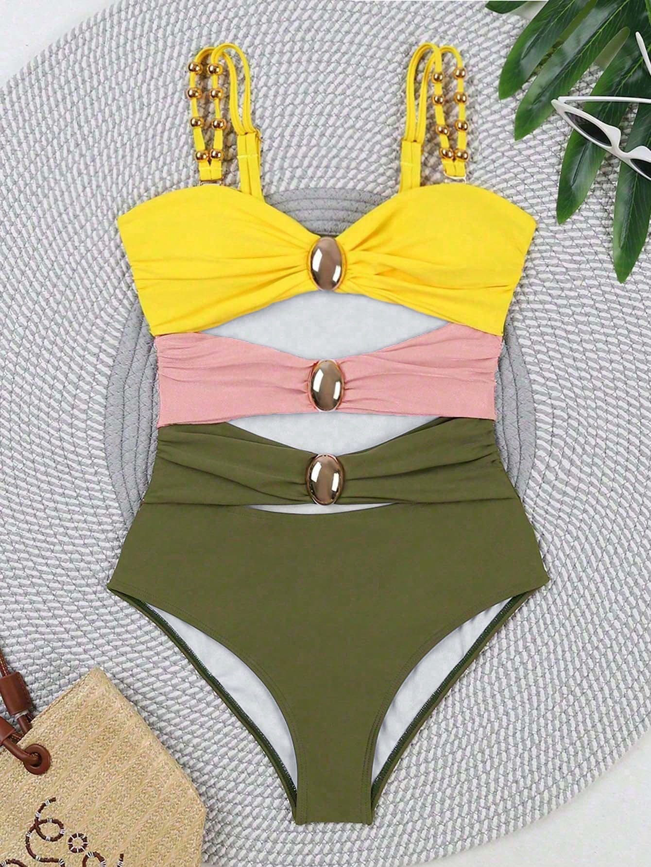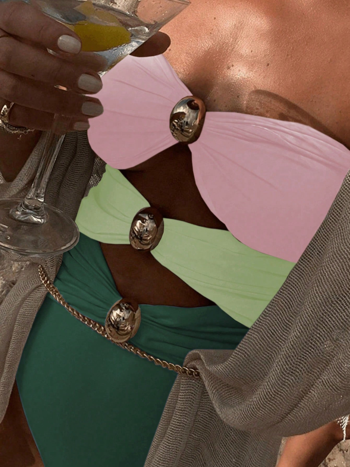 Copy| Product Name | Women's Gold Buttons Color-Blocking Three-Color Sexy One-Piece Swimsuit |