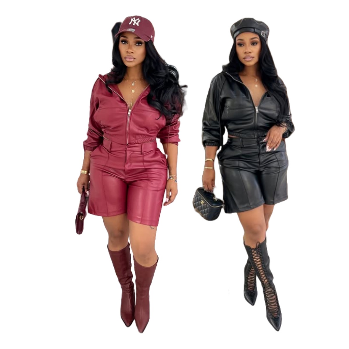 Copy| Product Name | Women's Leather Hooded Long Sleeve Shorts Set |