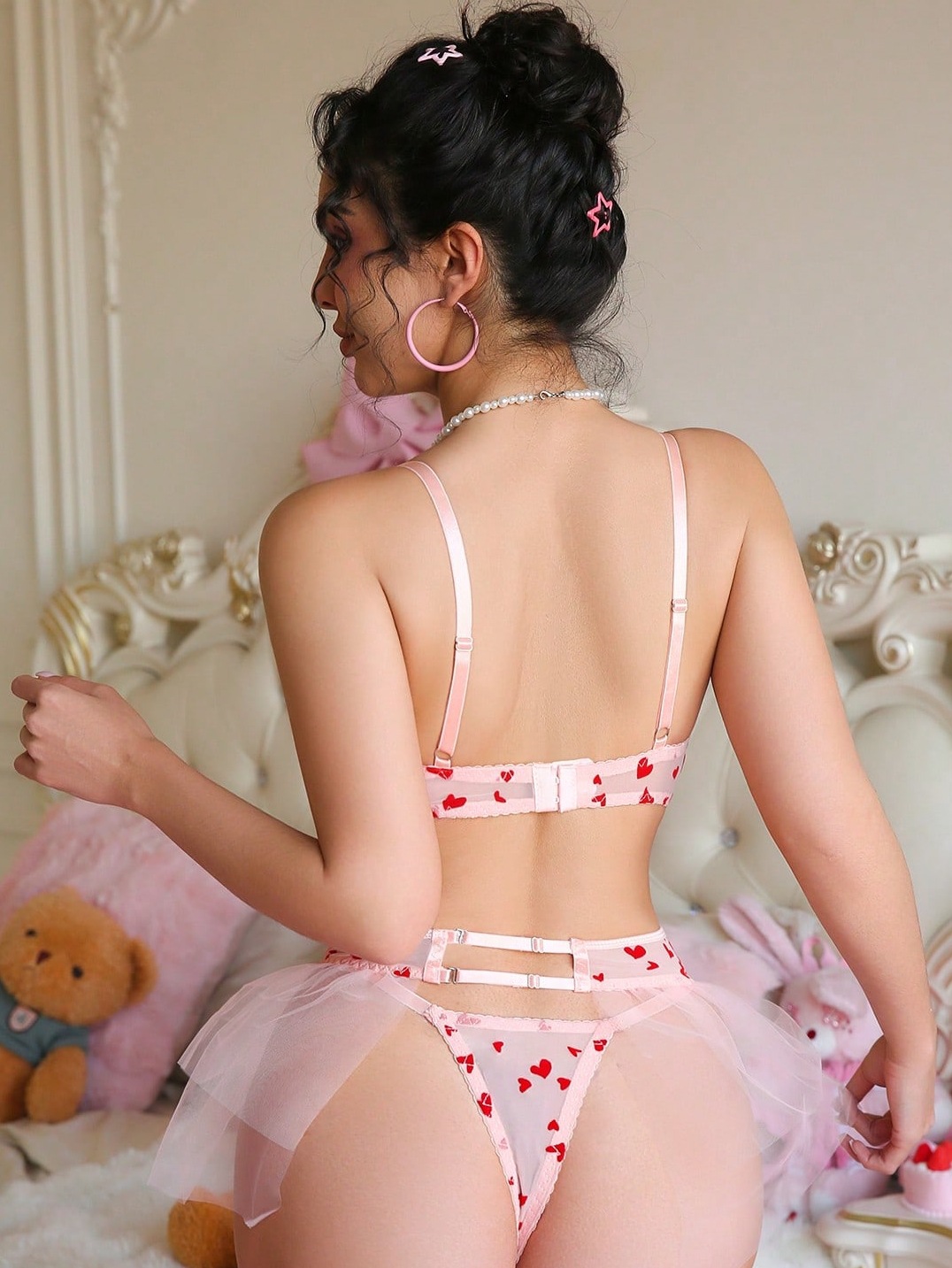 Copy| Product Name | Women's Mesh Double-Sided Flocked Heart Print Flared Skirt Lingerie Set |