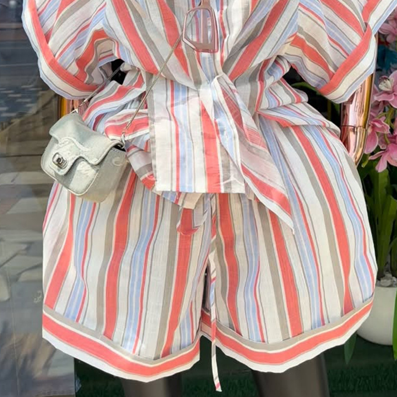 Copy| Product Name | Women's Spring Fashion Striped Turndown Collar Short Sleeve Shirt & Tie-Waist Wide-Leg Shorts Set |