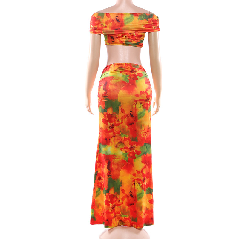 Copy| Product Name | Women's Spring Sexy Printed Off-Shoulder Crop Top & Low-Waist Skirt Set |