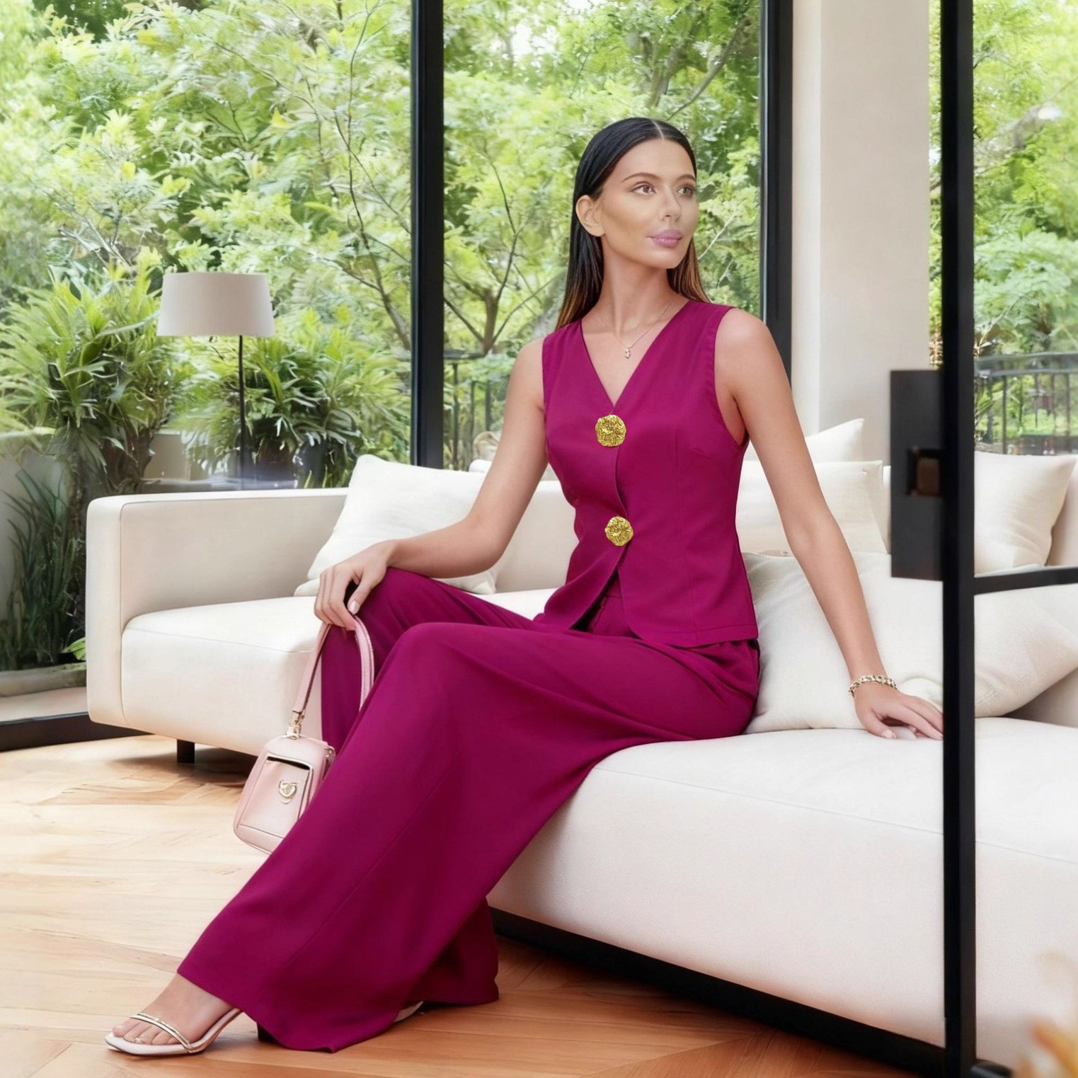 This Women's Spring Summer Fashion Casual Button Vest And Pants Two-Piece Set Design Made Of High Quality Polyster And Spandex Material. It Is Stretchy, Durable And Comfortable. It Is a Must-Have Outfit For All Seasons. Wholesale Two Piece Pant Sets Can Solve Your Collocation Troubles. Explore More 2 Piece Pants Set On Global Lover Wholesale Women Clothing Online Store.