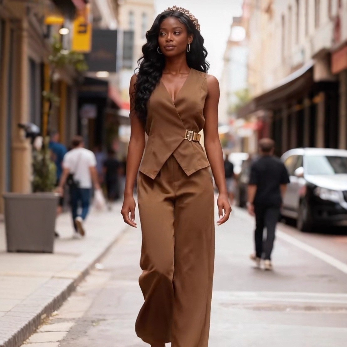 This Women's Summer Career Sleeveless v-Neck Vest And Wide-Leg Pants Set Design Made Of High Quality Polyster And Spandex Material. It Is Stretchy, Durable And Comfortable. It Is a Must-Have Outfit For All Seasons. Wholesale Two Piece Pant Sets Can Solve Your Collocation Troubles. Explore More 2 Piece Pants Set On Global Lover Wholesale Women Clothing Online Store.